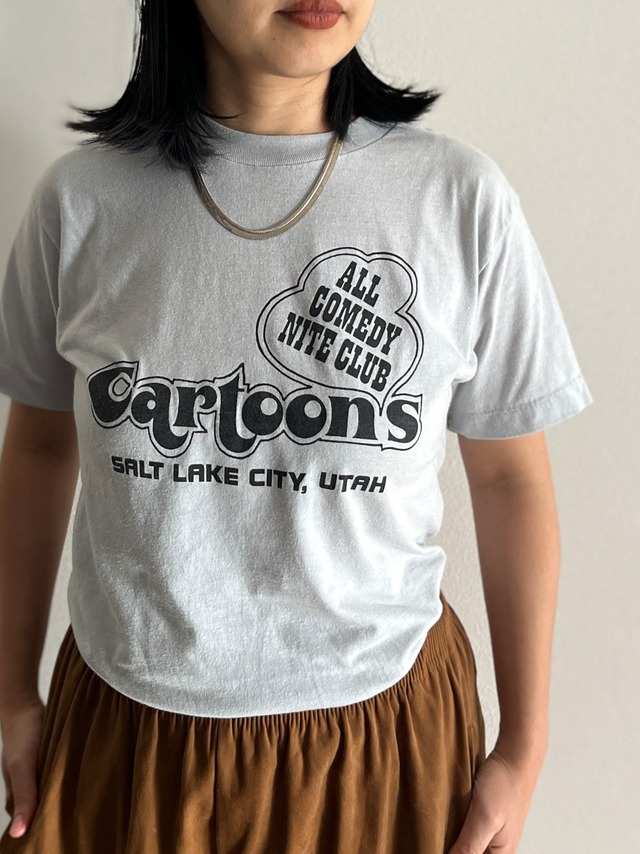 Body: Ched by ANVIL Made in U.S.A. Materials: コットン50% / ポリエステル50% Condition: A ユーズドでも使用感やダメージが少なく綺麗な状態。 Color: Light Blue Gray Size: L (やや縮みが入り、現状Mサイズに相当します。下記をご確認ください) 着丈 64cm / 肩幅 43cm / 身幅 49cm / 袖丈 17.5cm *採寸は平置きで行っております。多少の誤差はご了承ください。 Model: 158cm 『Anvil』・・・1899年にアメリカでアンダーウェアメーカーとして誕生し、120年以上の伝統を誇る老舗ブランド。Tシャツを製造し始めたのは1976年で、これまで下着だったTシャツを丈夫で豊富なデザイン展開によりファッションアイテムへと昇華させた。 キラッとした光沢が少し残ったプリントのデザインが素敵なこちら。 今は無くなってしまったようですが、ユタ州ソルトレイクシティのコメディクラブのTシャツのようです。お笑い好き、スタンドアップコメディ好きの方にもおすすめ! 80年代らしいすっきりとしたボディと、ライトブルーグレーのカラーも最高です。 オンブレのシャツやモヘアニットの下など、古着との相性抜群の一枚です。