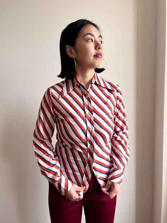 Made in Switzerland Materials: ポリエステル65% / コットン35% Condition: A ユーズドでも使用感やダメージが少なく綺麗な状態。 Color: Multi Pattern: stripe Size: 38 (Sサイズ相当です。下記をご確認ください) 着丈 60cm / 肩幅 36.5cm / 身幅 43cm / 袖丈 56cm *採寸は平置きで行っております。多少の誤差はご了承ください。 Model: 158cm 水が綺麗で糸の質も良いスイス製のストライプシャツです。コットン35%ですが、ほぼコットンのような柔らかさ。 わざと柄をずらした前立てやカフスが、POPなシャツの雰囲気を底上げしてくれます。 70年代らしいウエストのシェイプやロングポイントの襟も古着ならではの一着。