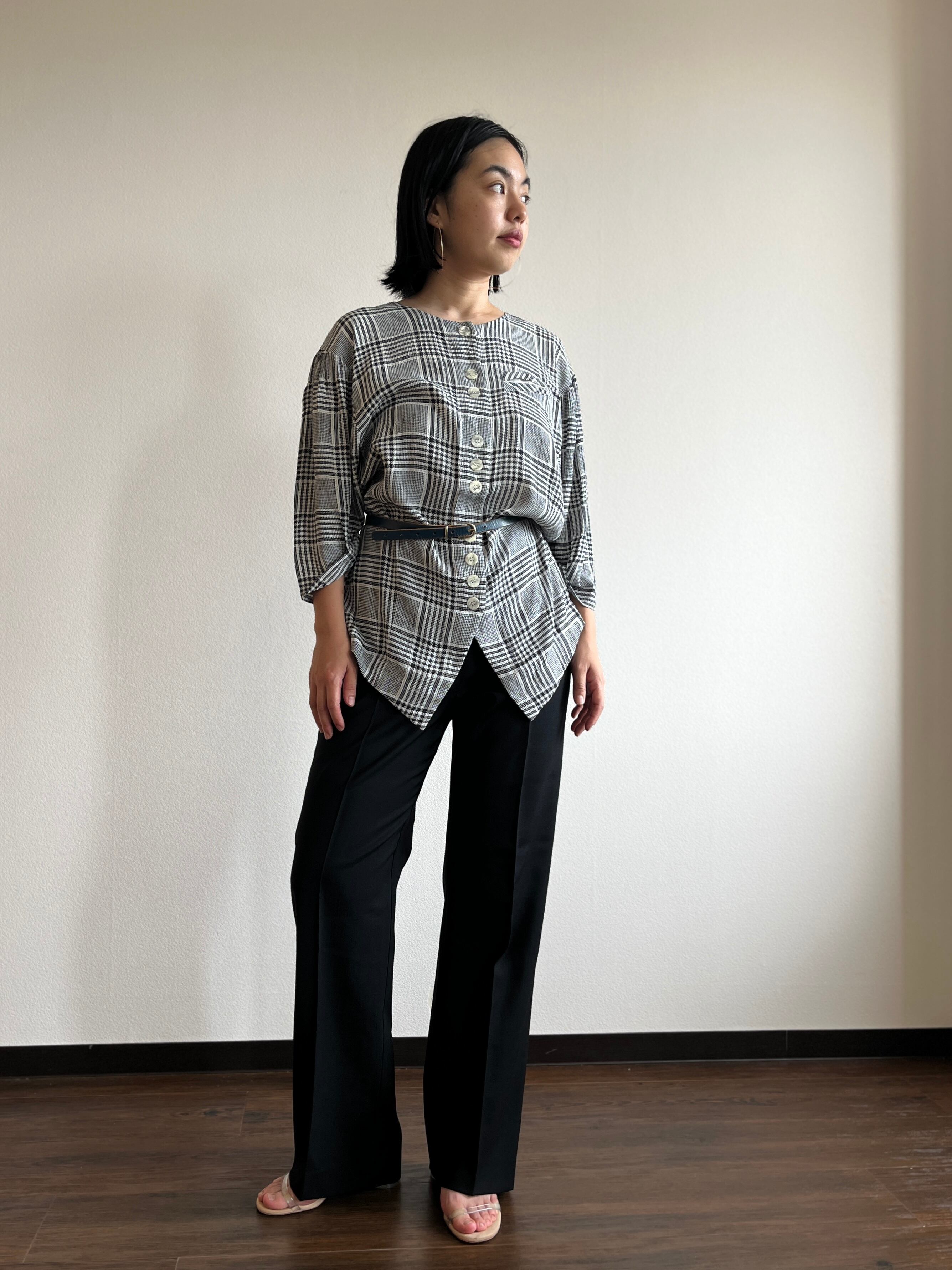 落ち感のあるシルクタッチの格子のレーヨンボディに、パターン技術の素晴らしさが詰まった一着。