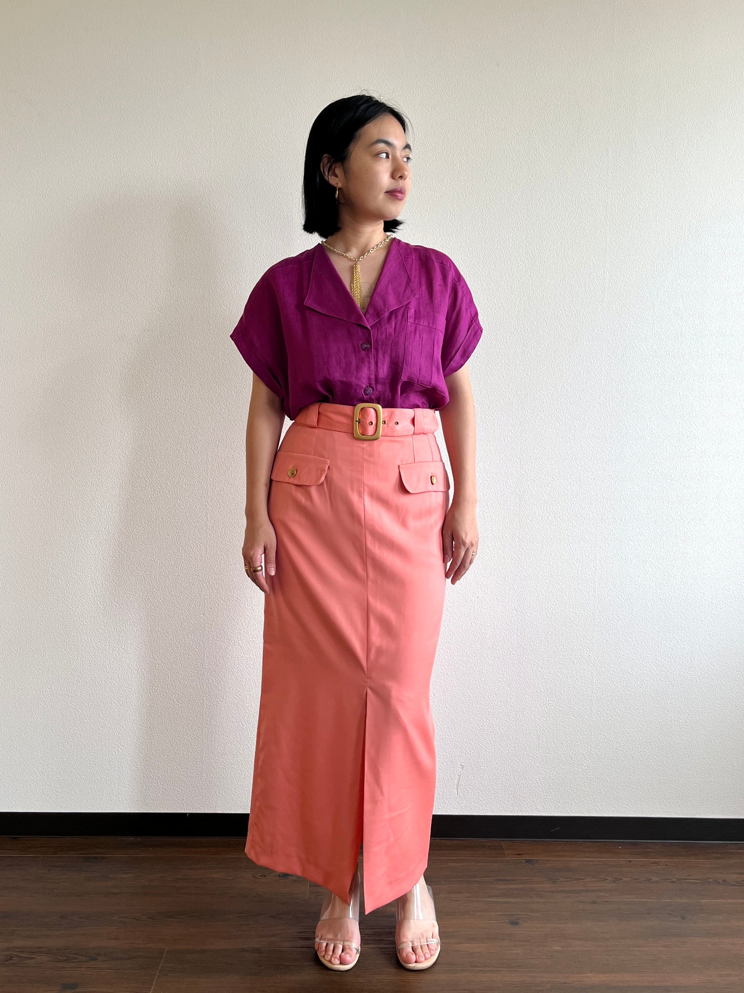 リネン100%のブラウスはぺらっとしてカジュアルに見え過ぎることがありますが、襟元や袖口の折り返し・ポケットのプリーツなど、立体感を持たせた丁寧な作りなのできちんとした印象を与えてくれる優秀なブラウスです。
