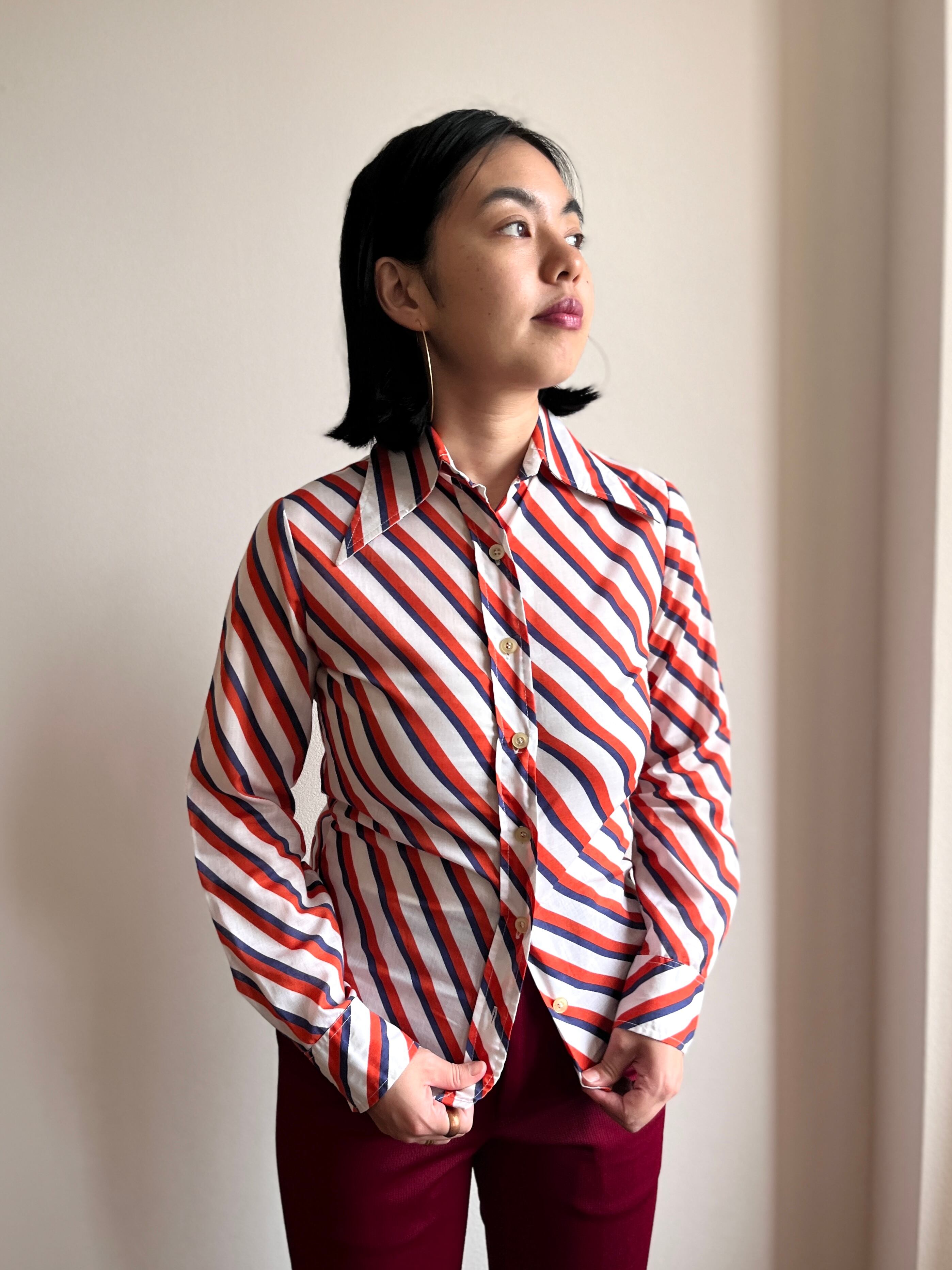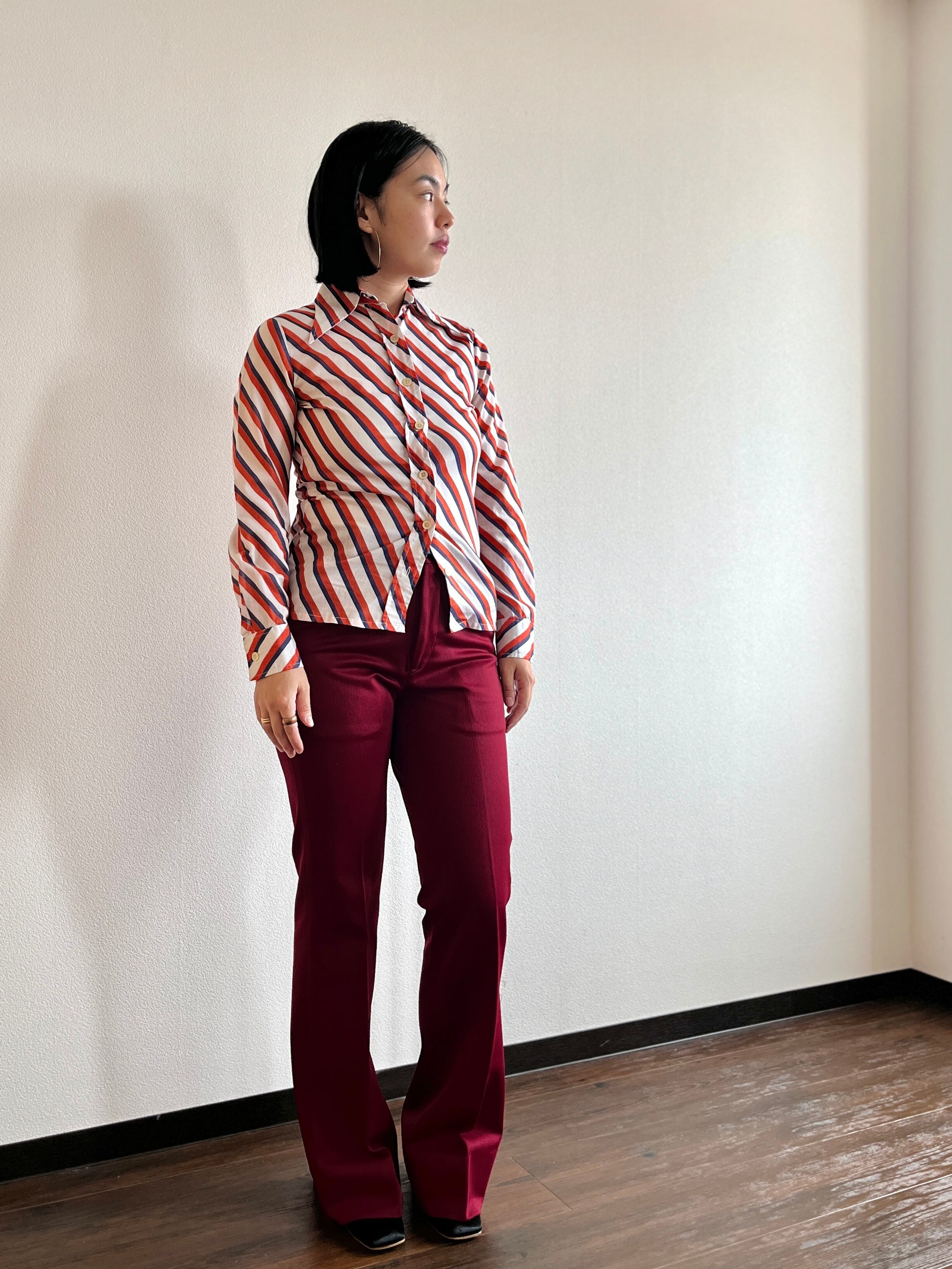 70年代らしいウエストのシェイプやロングポイントの襟も古着ならではの一着。