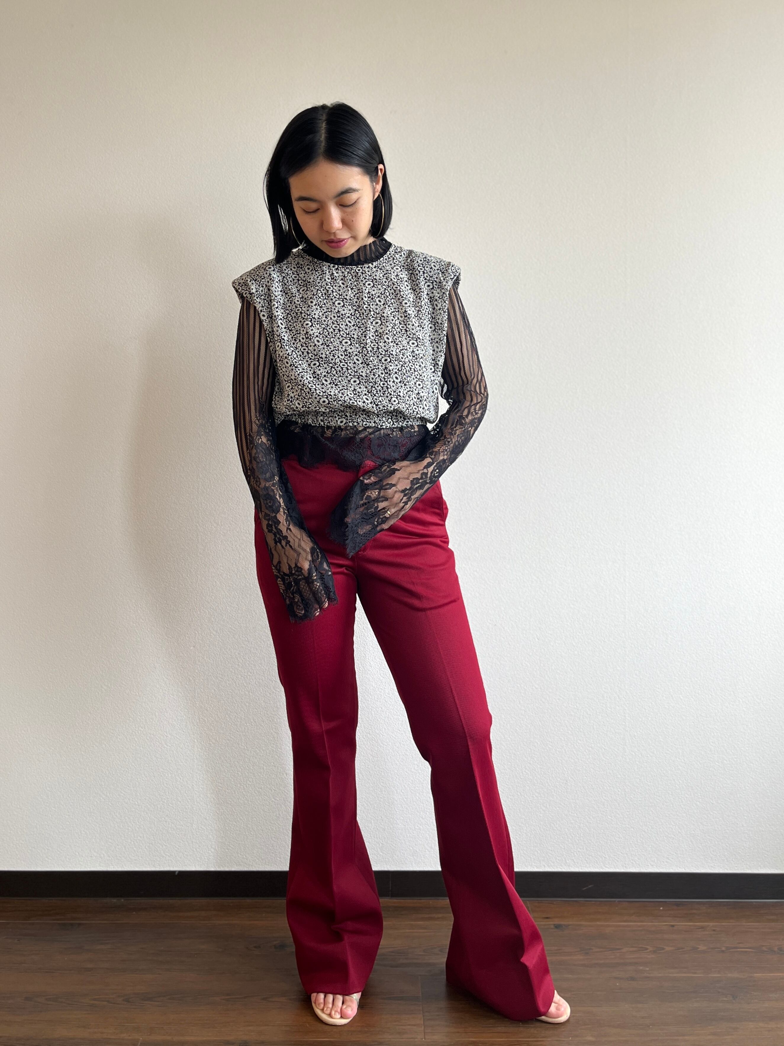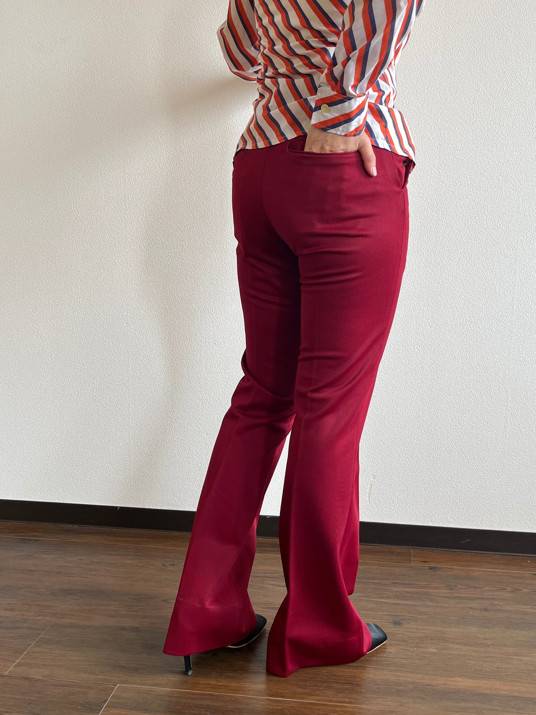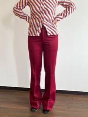 ジャージのような光沢のあるワインレッドのリブ生地×シルエット抜群のフレアラインは、今着るとまた新鮮で素敵です!