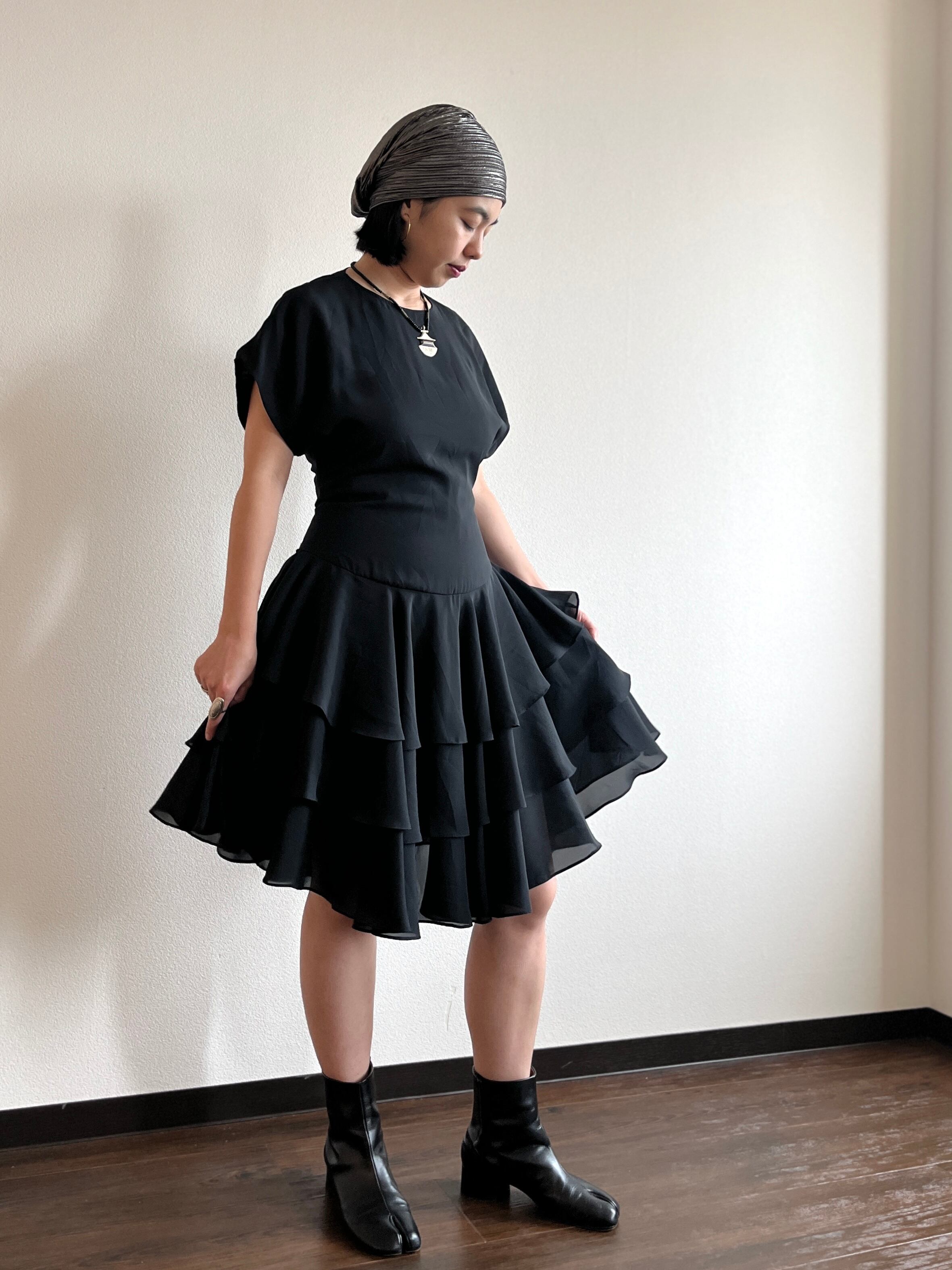パーティードレスを得意とする、サマンサブラックの3段フリルが効いたブラックドレス。