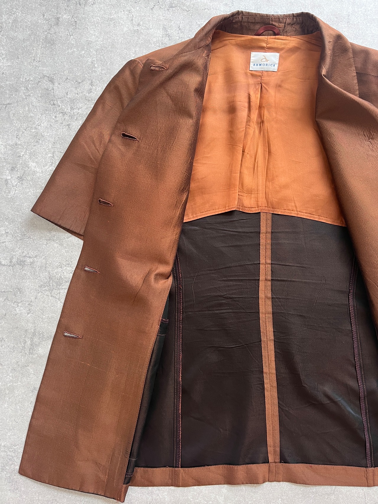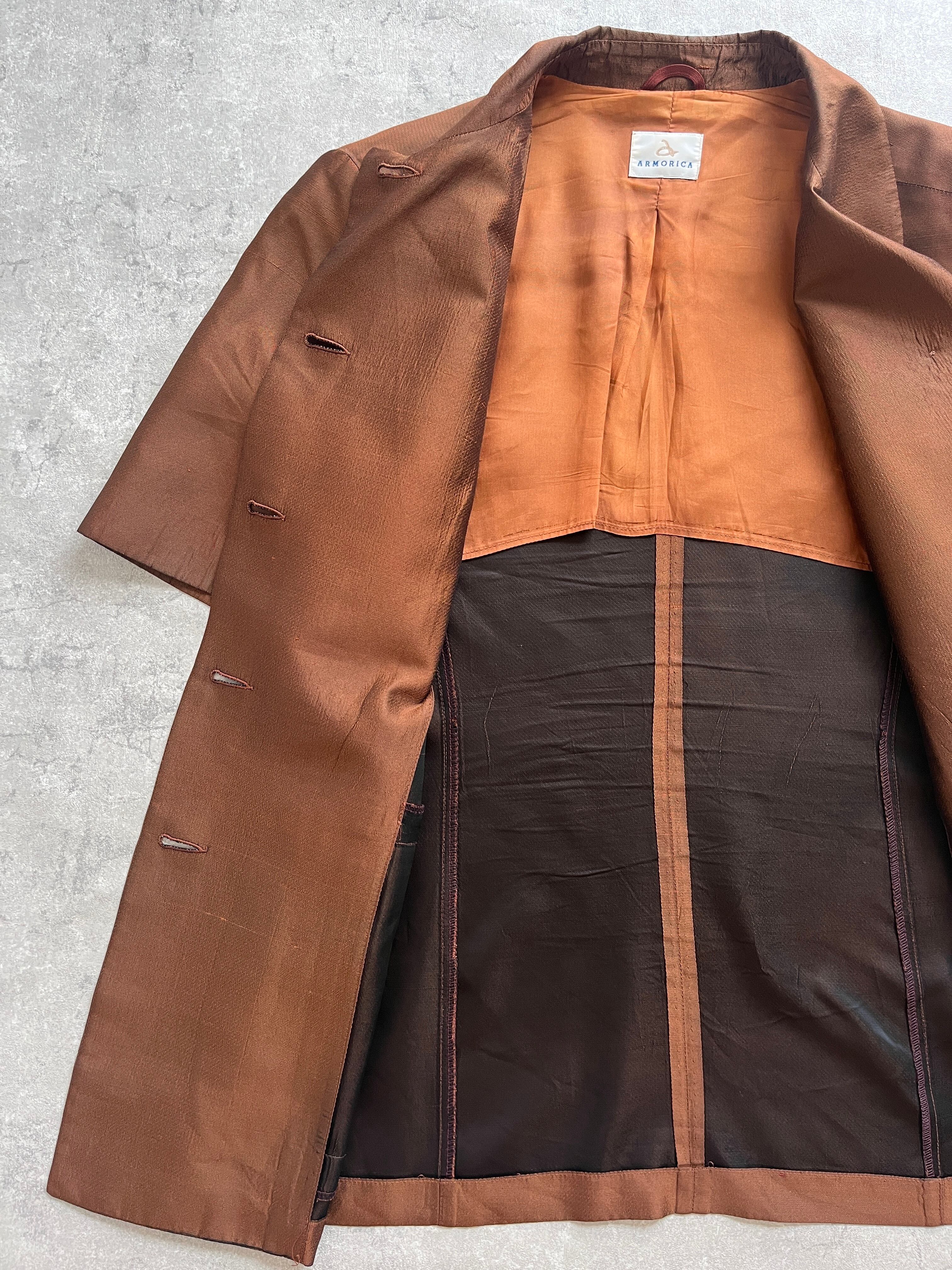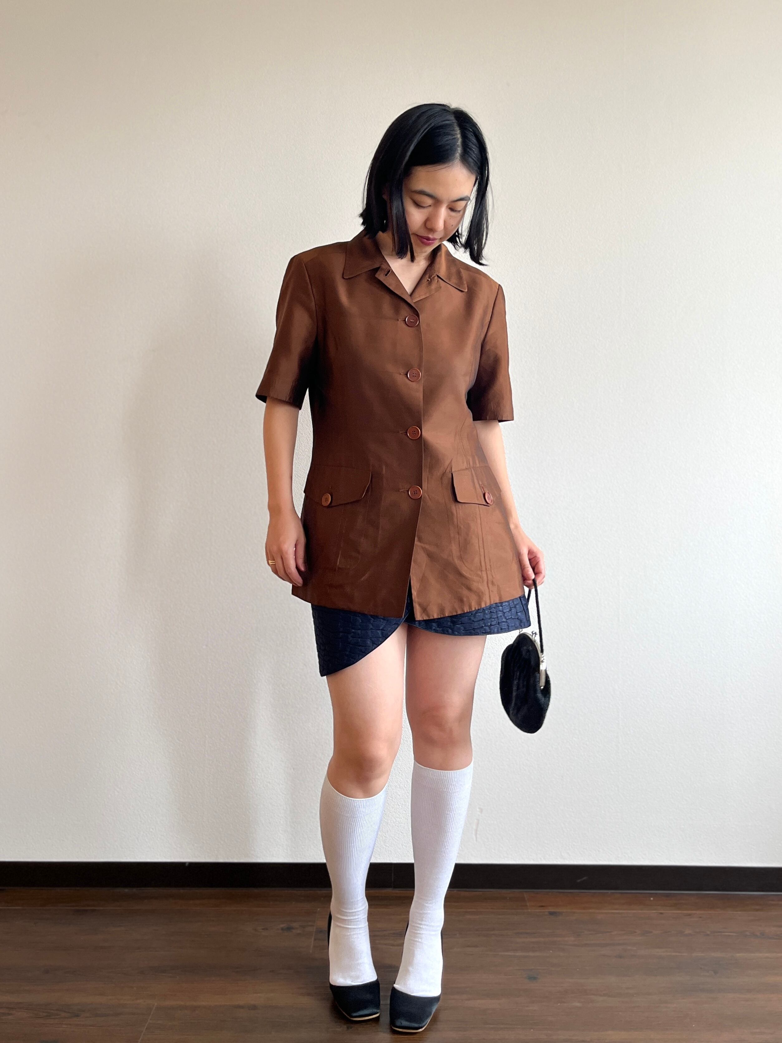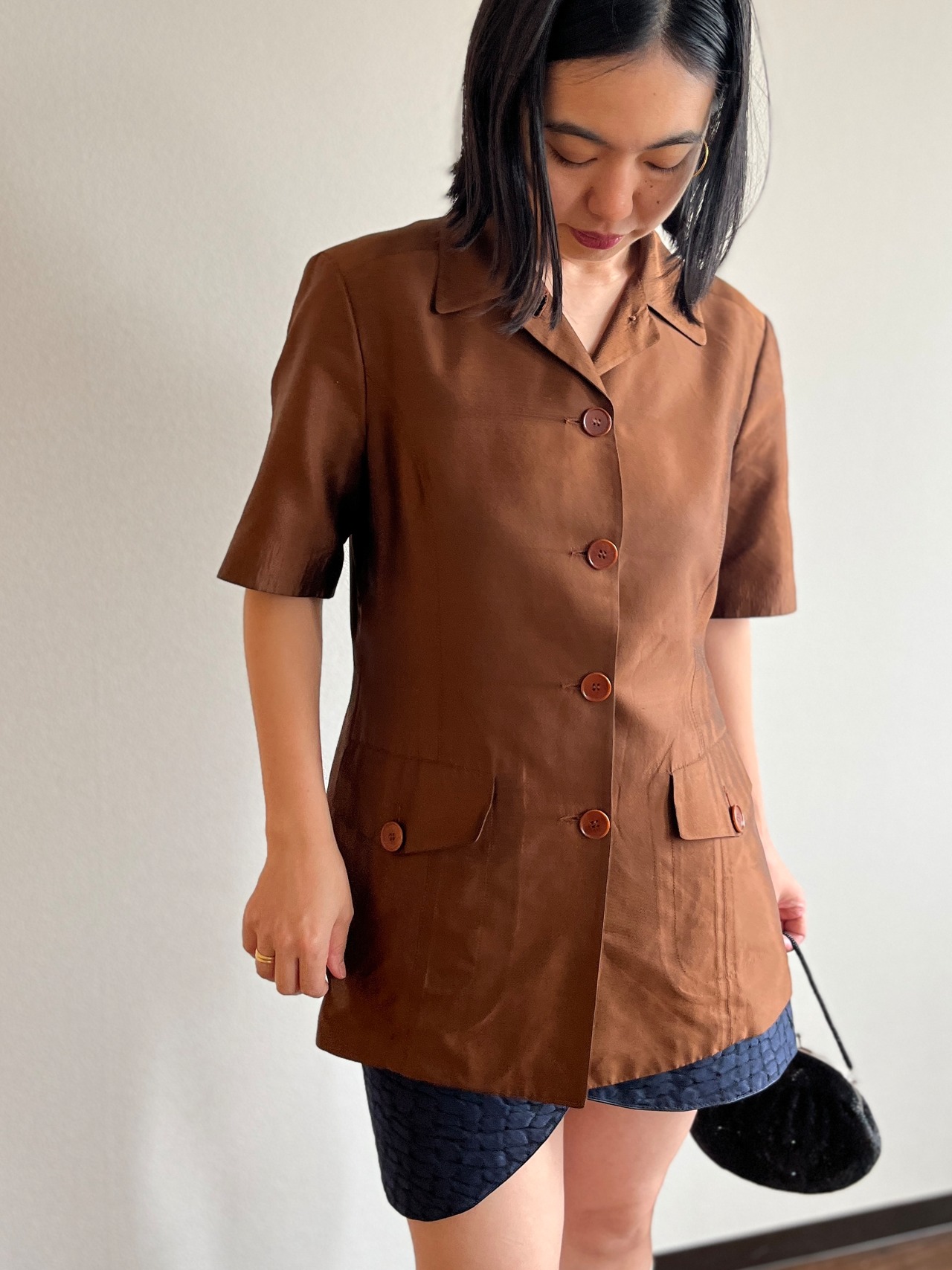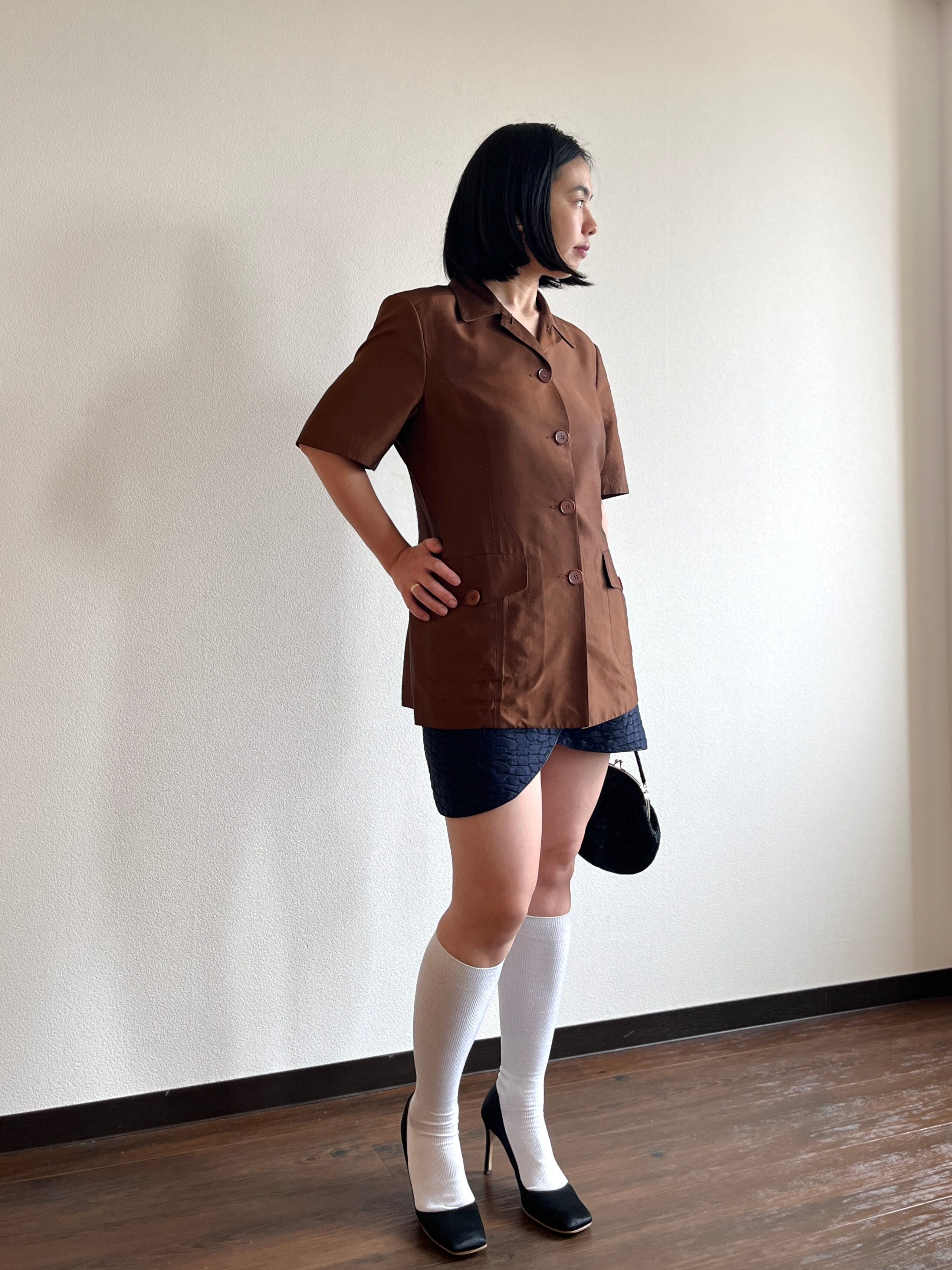 上質なアセテート×シルクの光沢と、ハンティングジャケットのようなデザインとの絶妙なバランスが面白いハーフスリーブジャケットです。