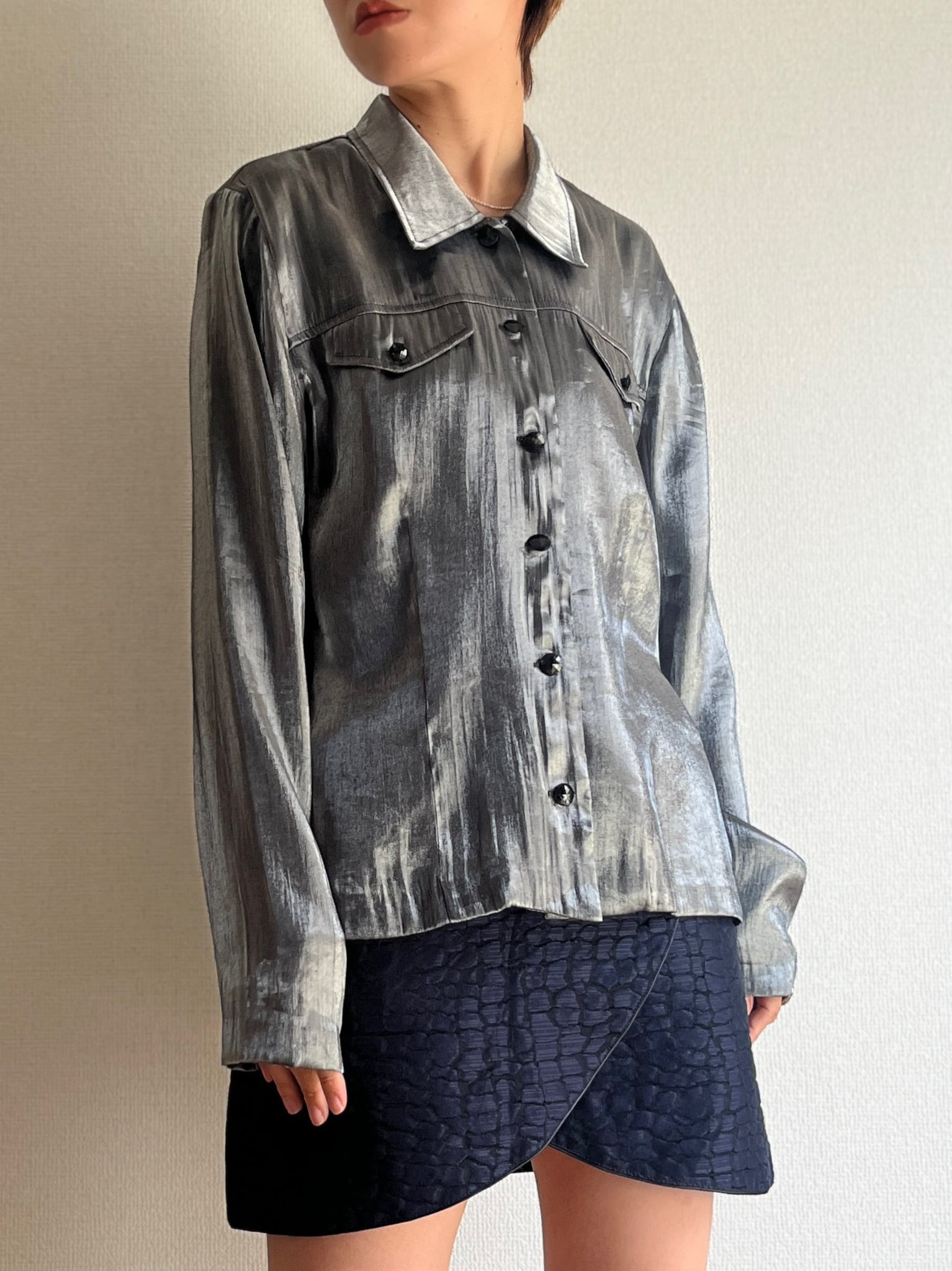Vゾーンの深い襟元や、胸ポケット(フェイク)、袖口や裾の始末の仕方が、シャツというよりジャケットのような美しい一着。