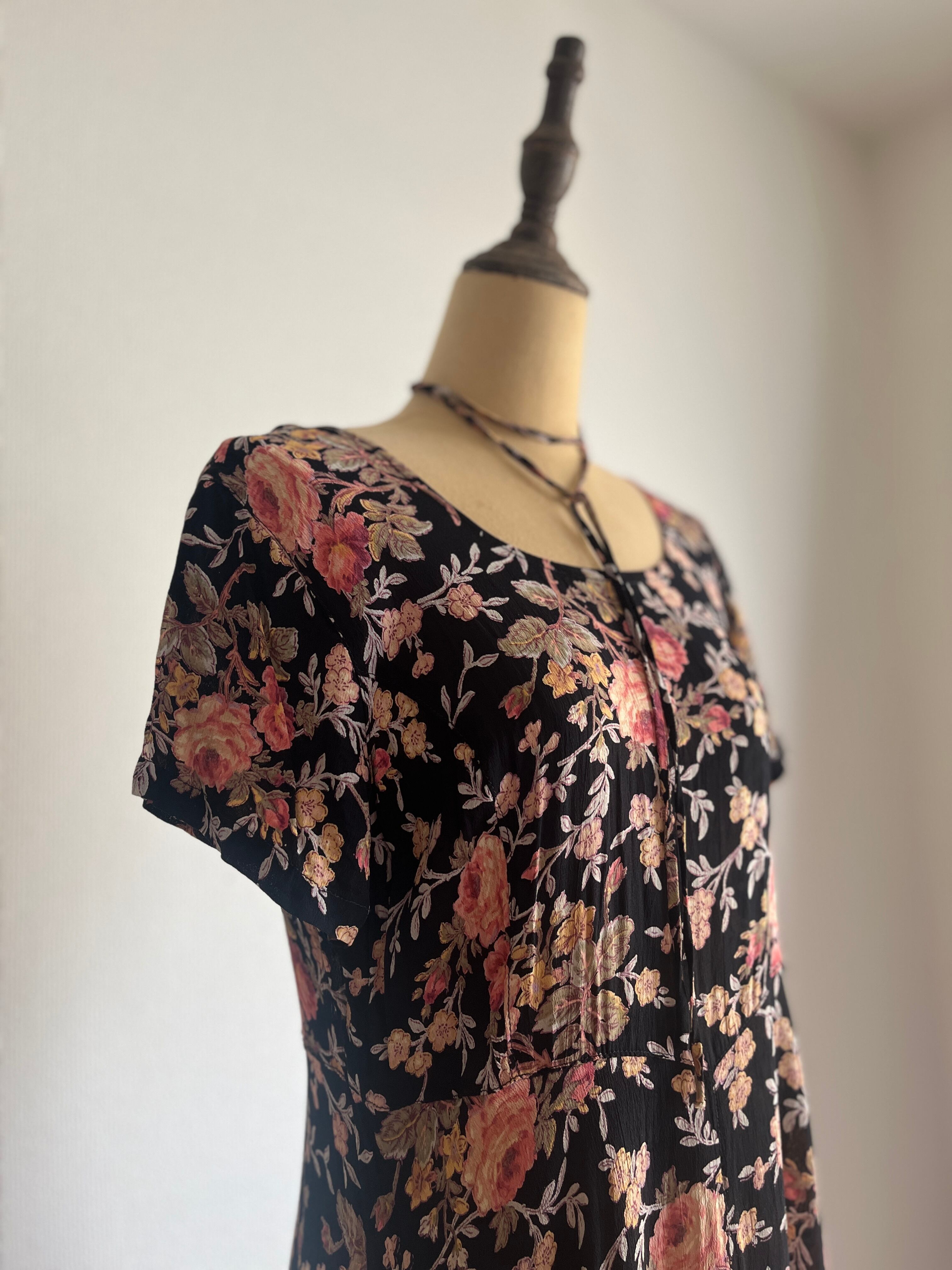 牡丹の花?のピンクが効いたブラックレーヨンドレス。