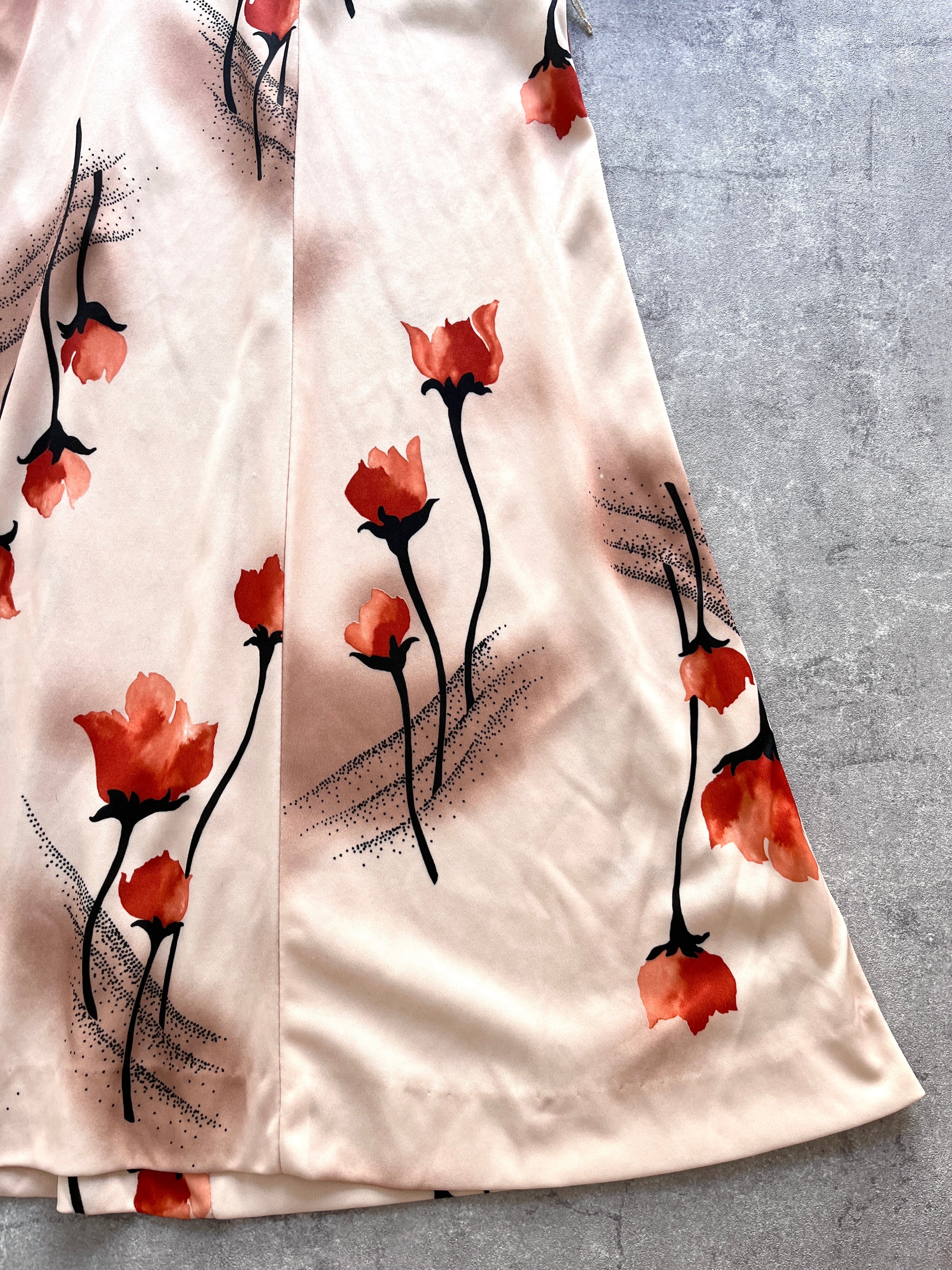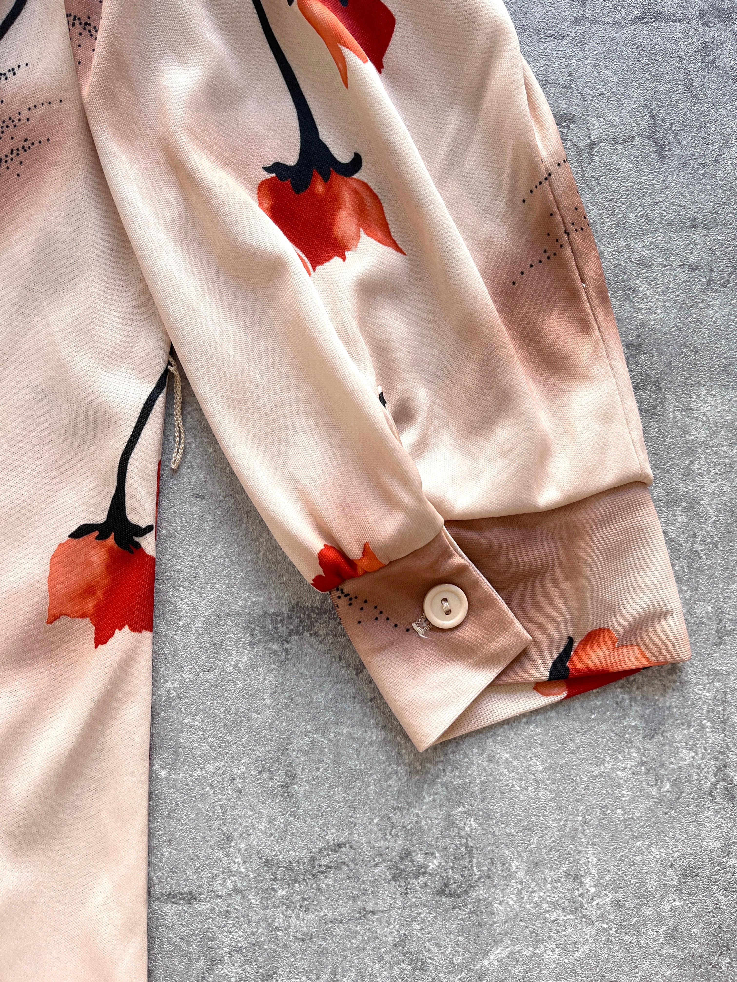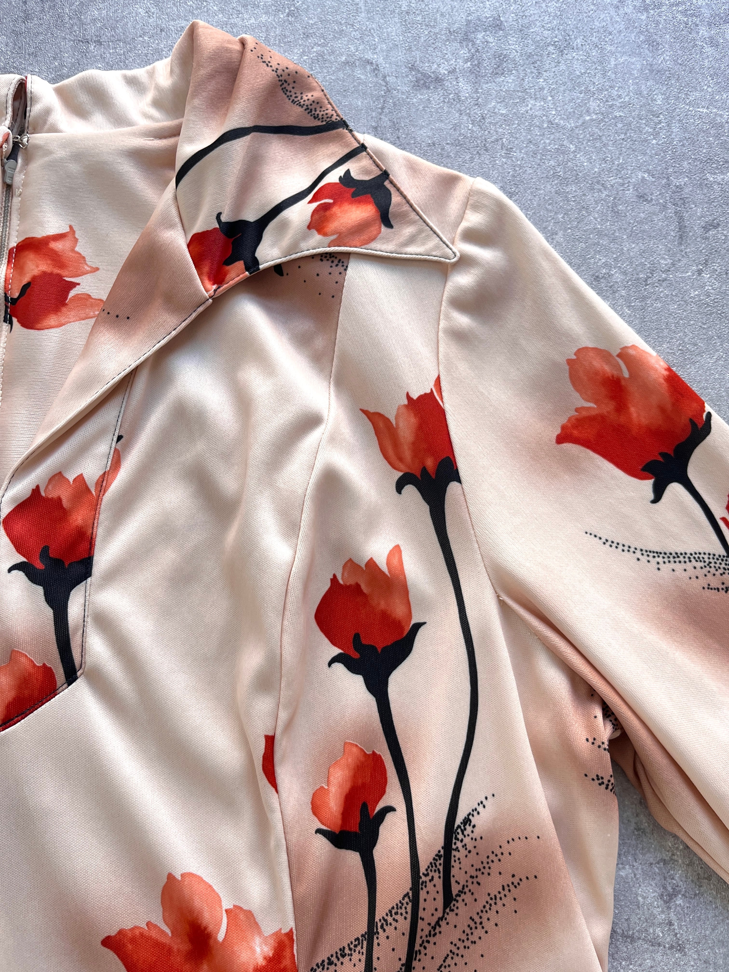 品の良い光沢とサラッとした着心地のピンクベージュの生地に、水彩画のようなダークオレンジの花柄が美しいヴィンテージドレスです。