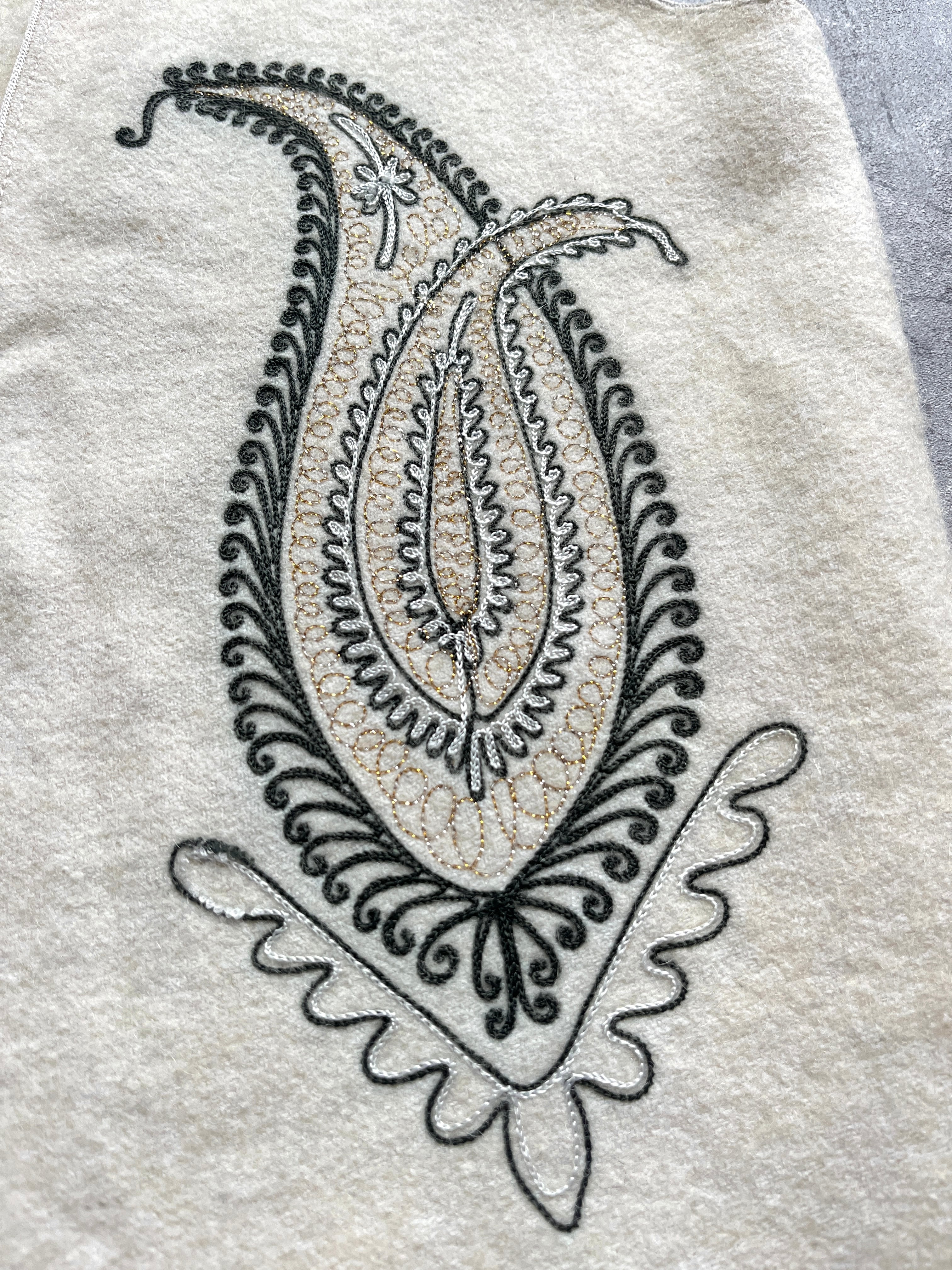アイボリー地にダークグリーンのペイズリー、金糸と銀糸がキラッと光る冬らしいカラーリングが素敵です。