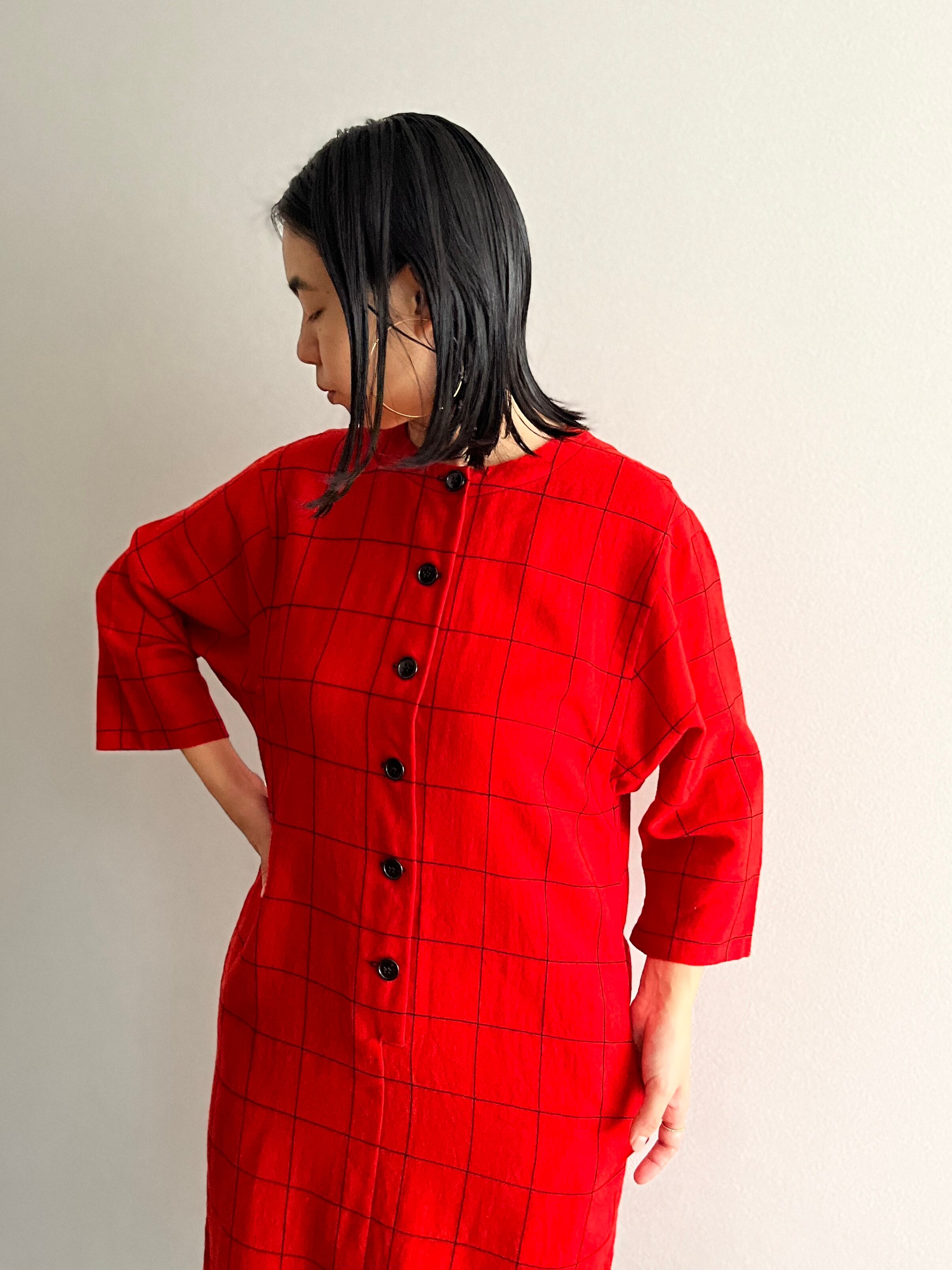 80年代の赤いワンピースと聞くと、肩パッドが入ったコンシャスなものを想像しますが、こちらはどこか60年代のクラシカルなムードが漂う上品なワンピース。