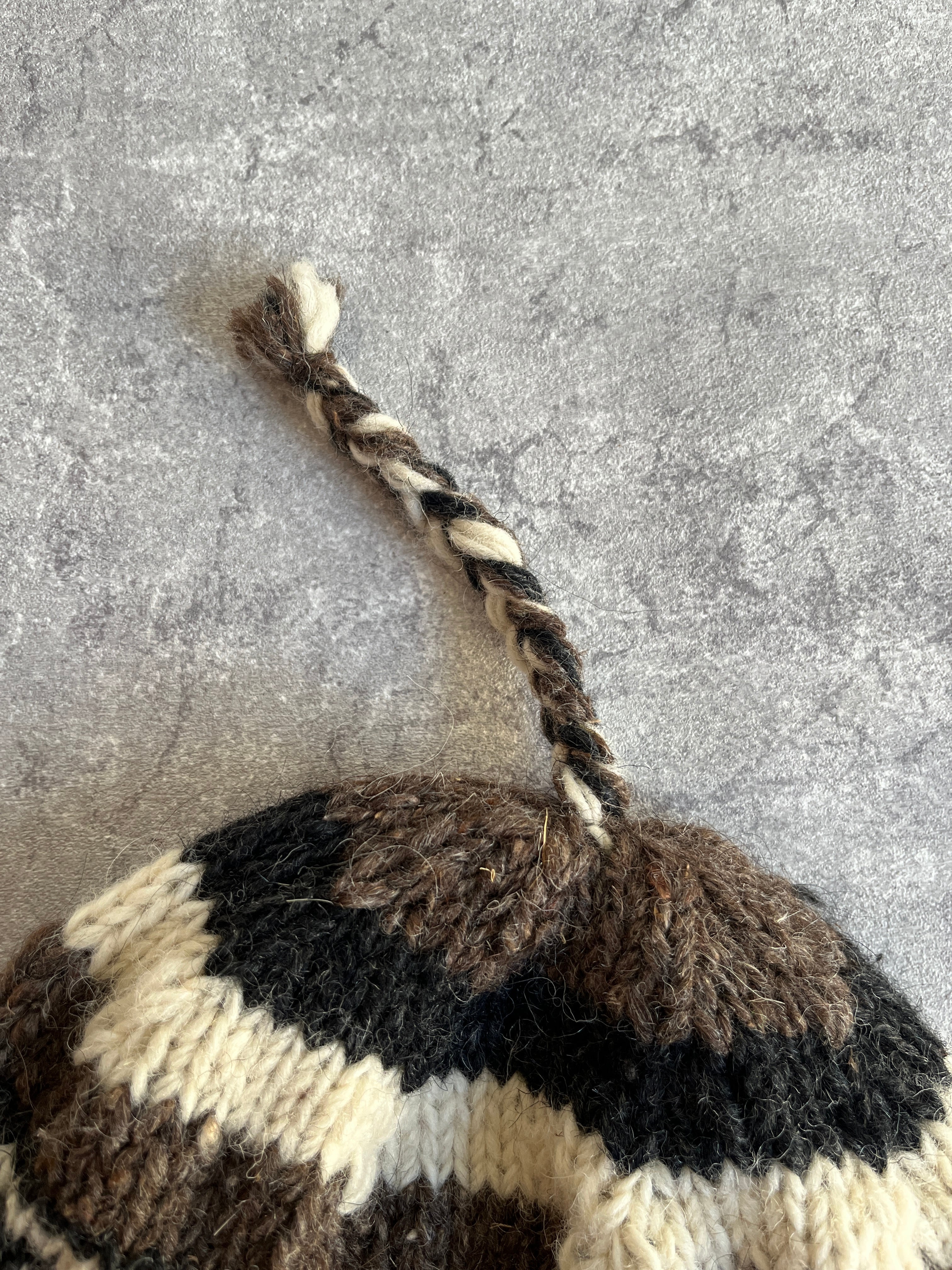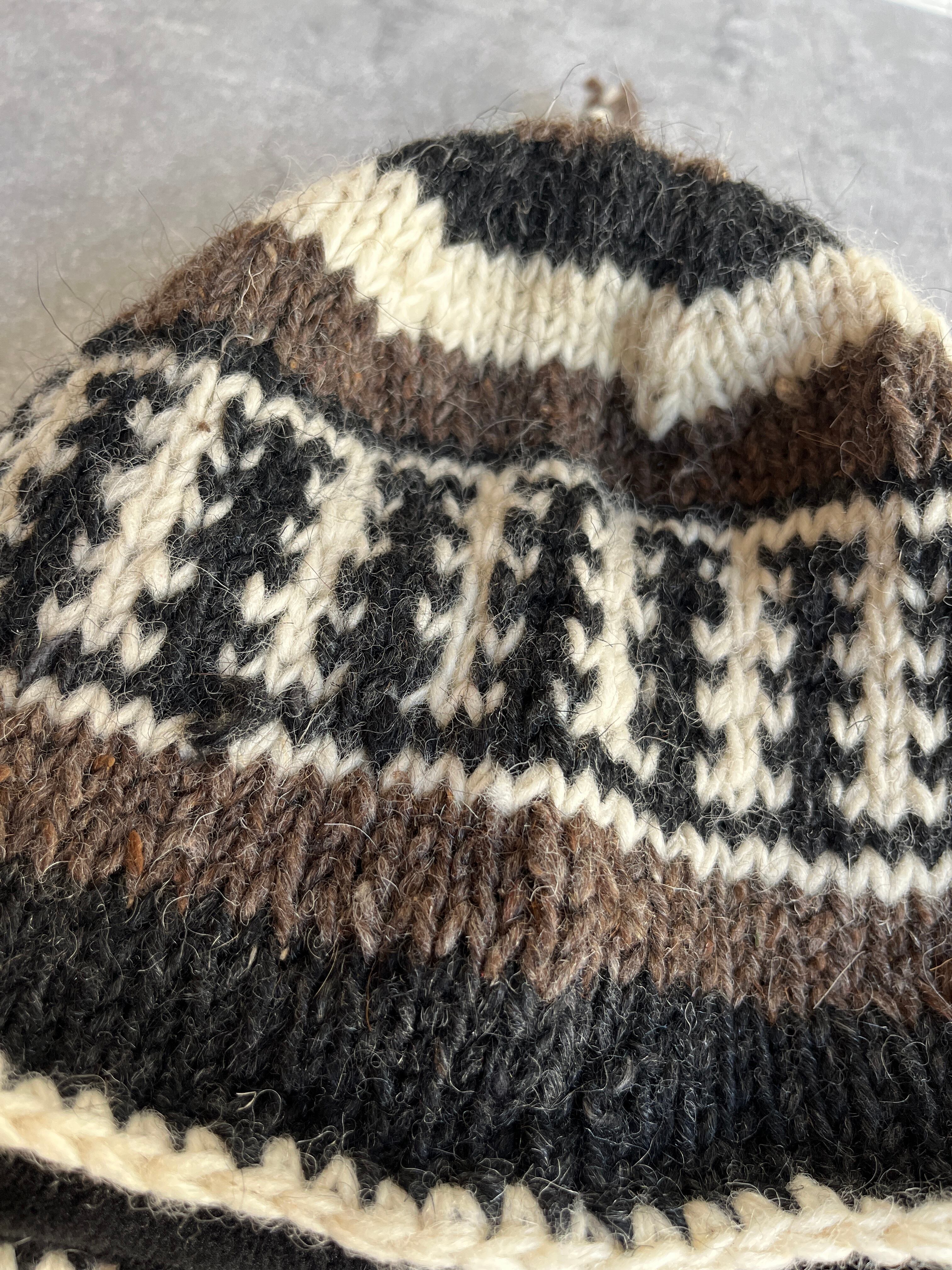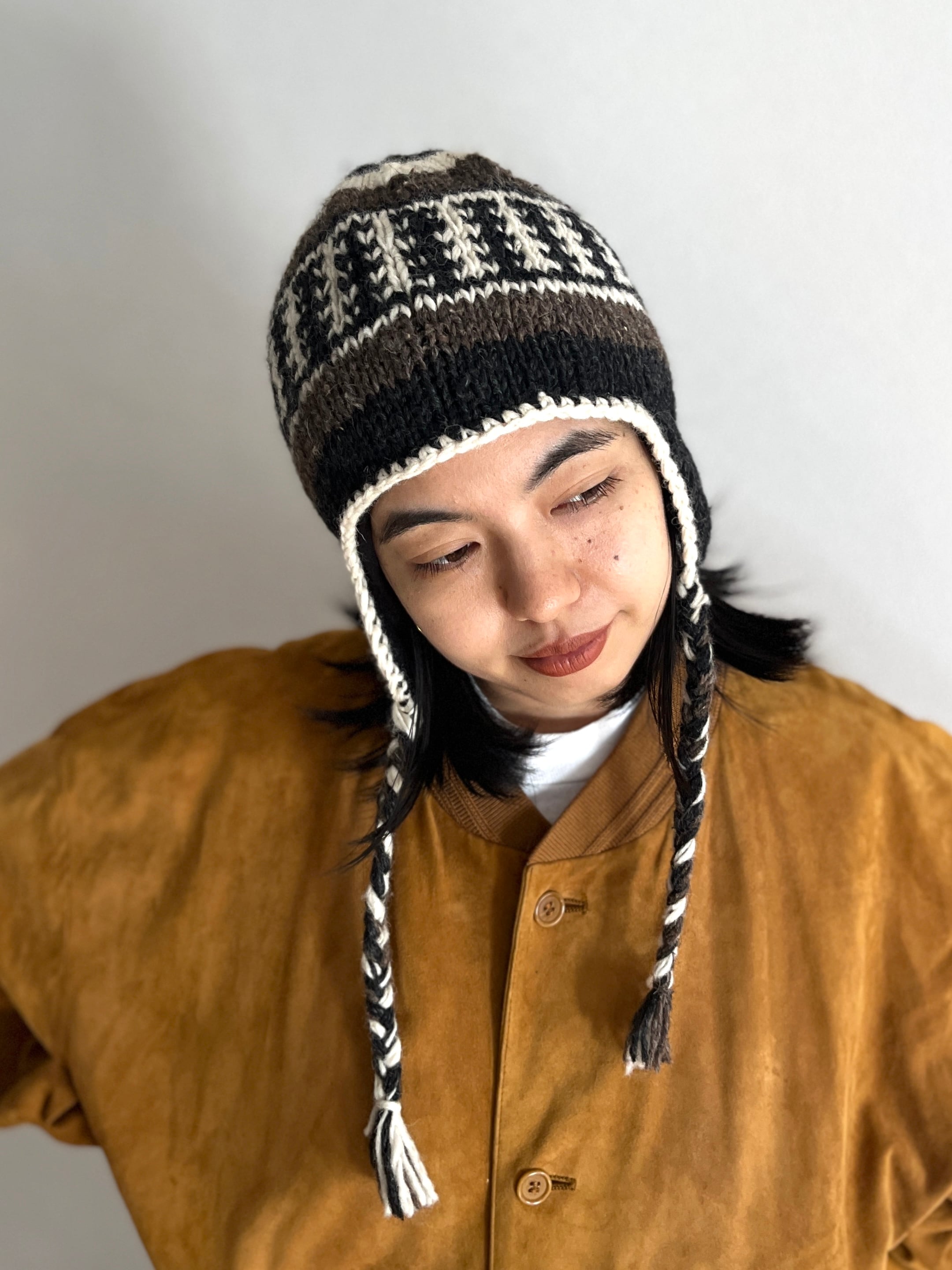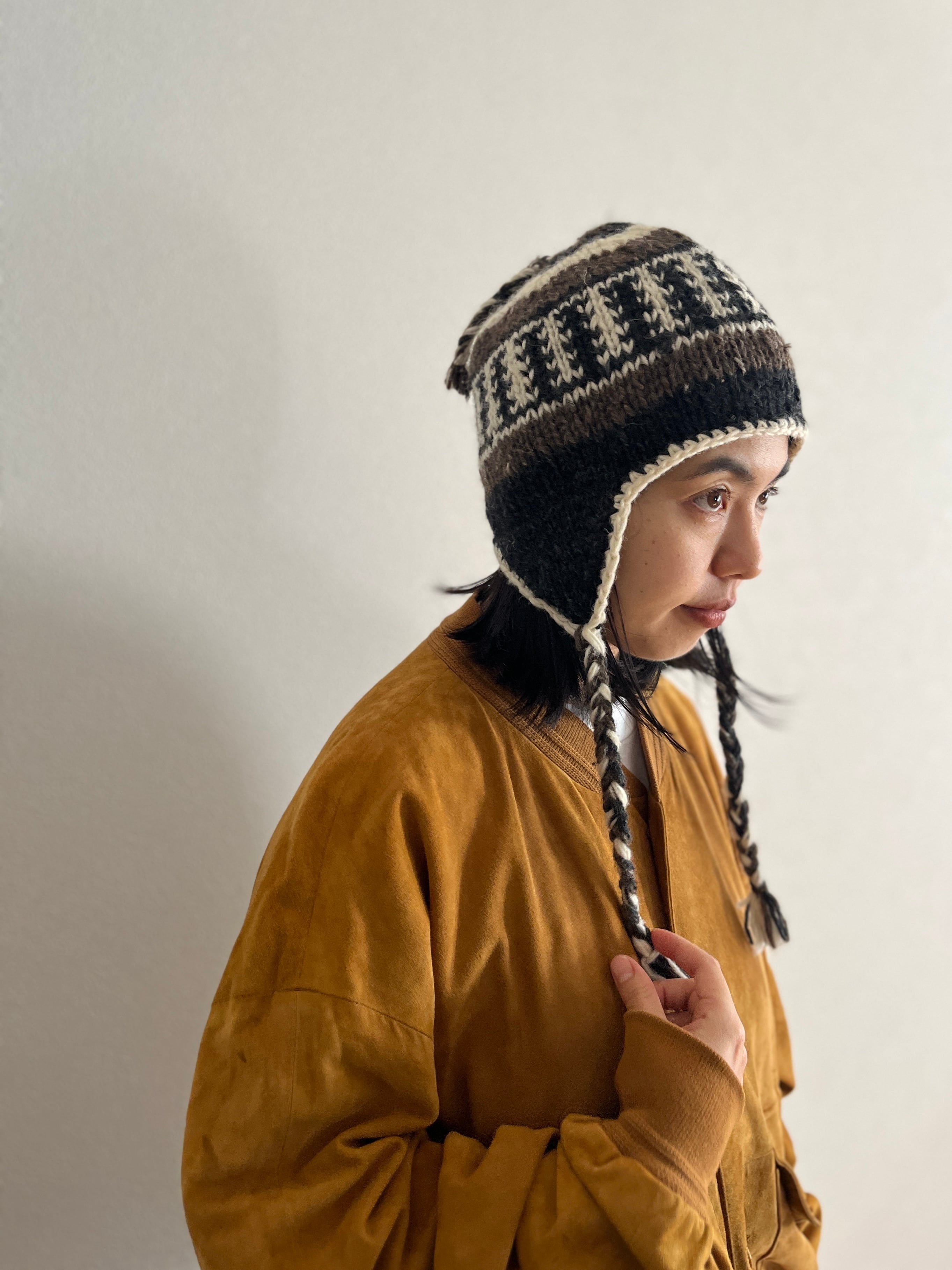 ネパールの伝統的な模様とフリンジのデザインが素敵な、耳当て付きのニット帽。