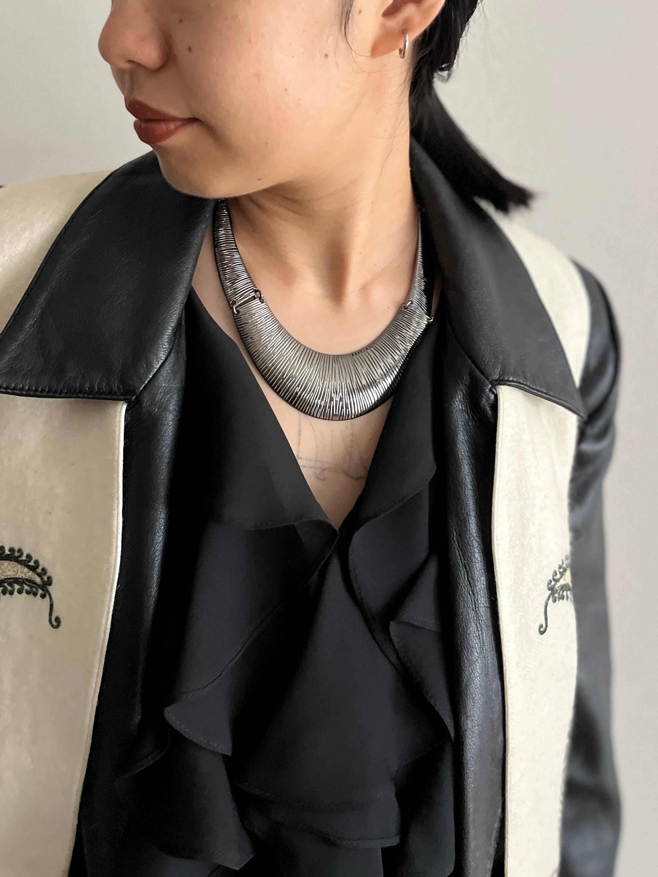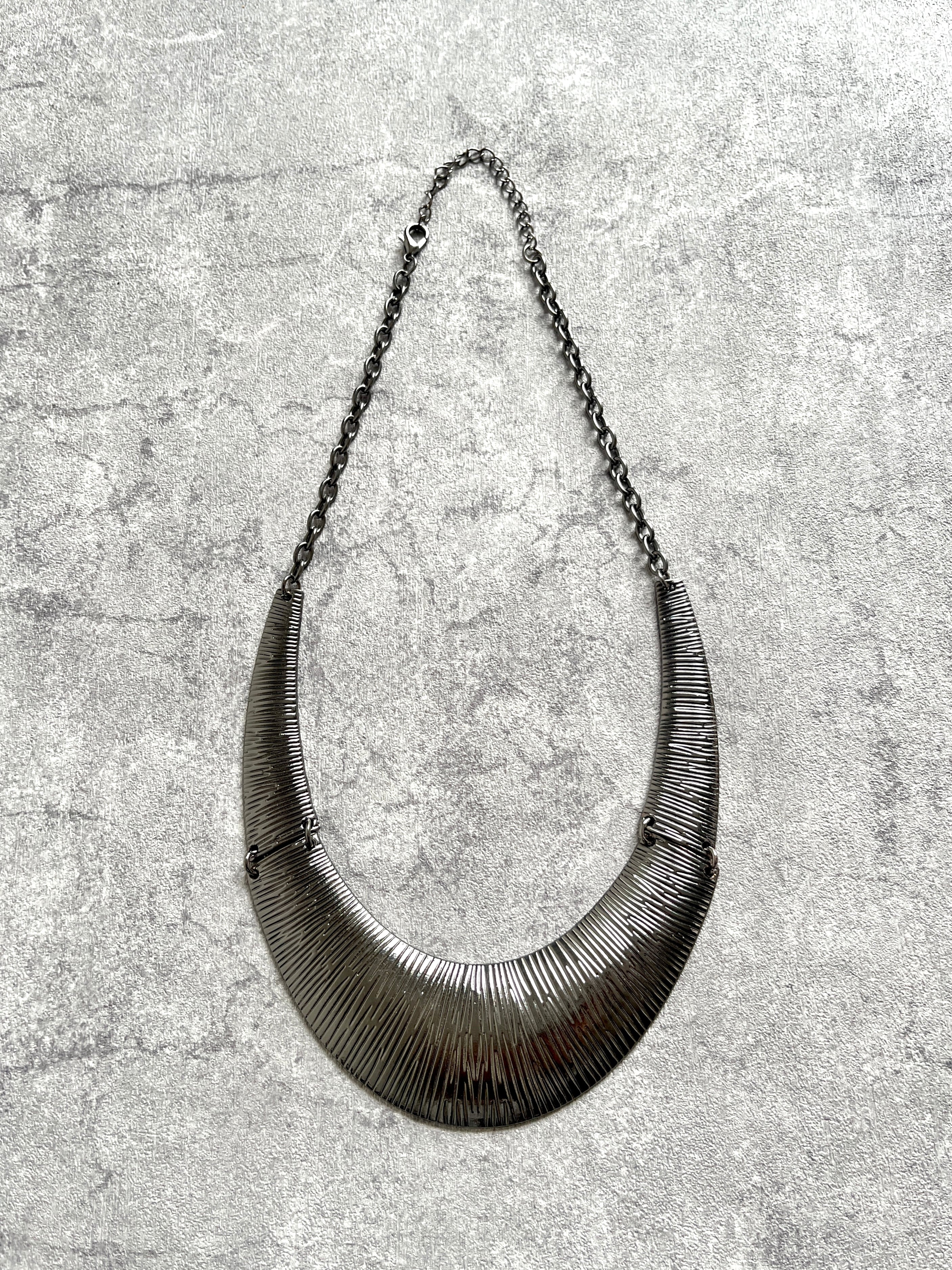 エスニックに多いプレート型のデザインを、彫りとコーティングでシャープに仕上げたこちらのネックレス。