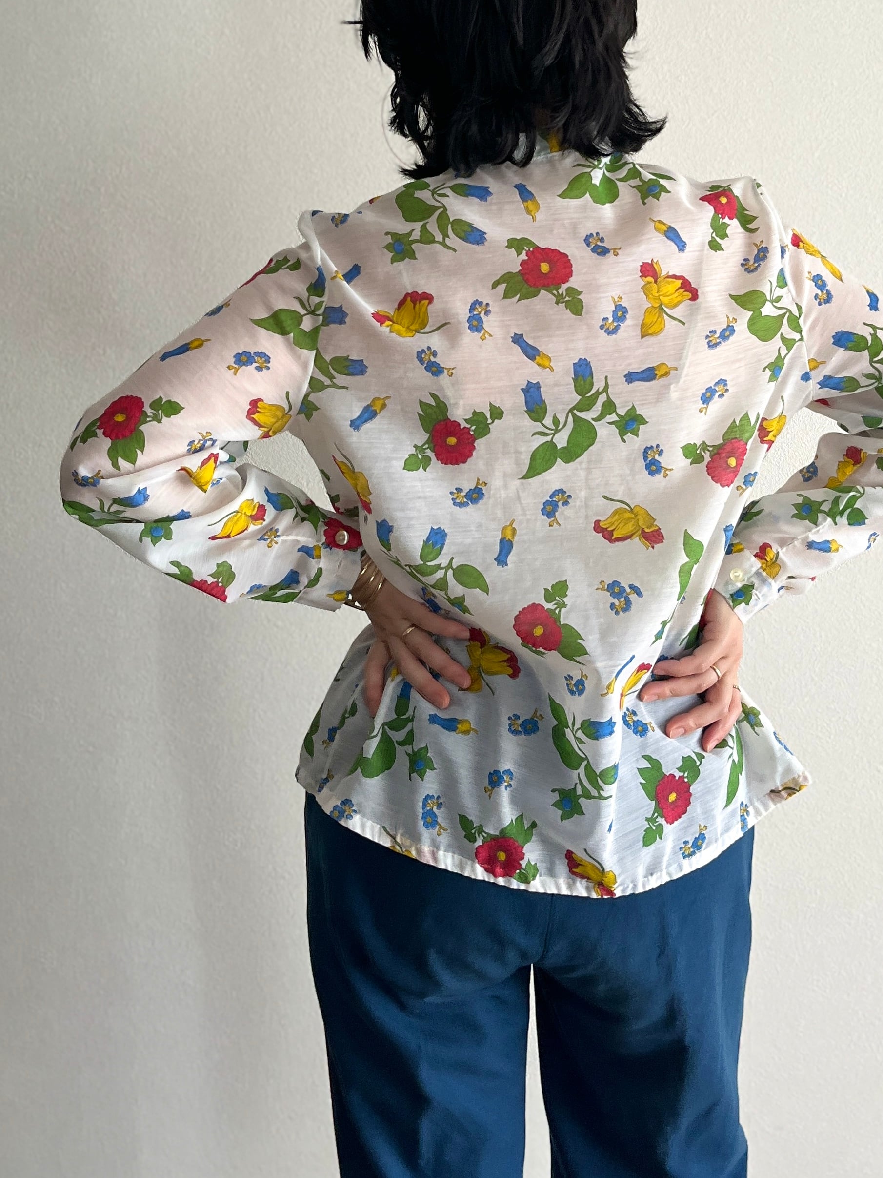 線画の花々に、点描のように細かく色付けされたプリントが綺麗な、70'sシャツです。