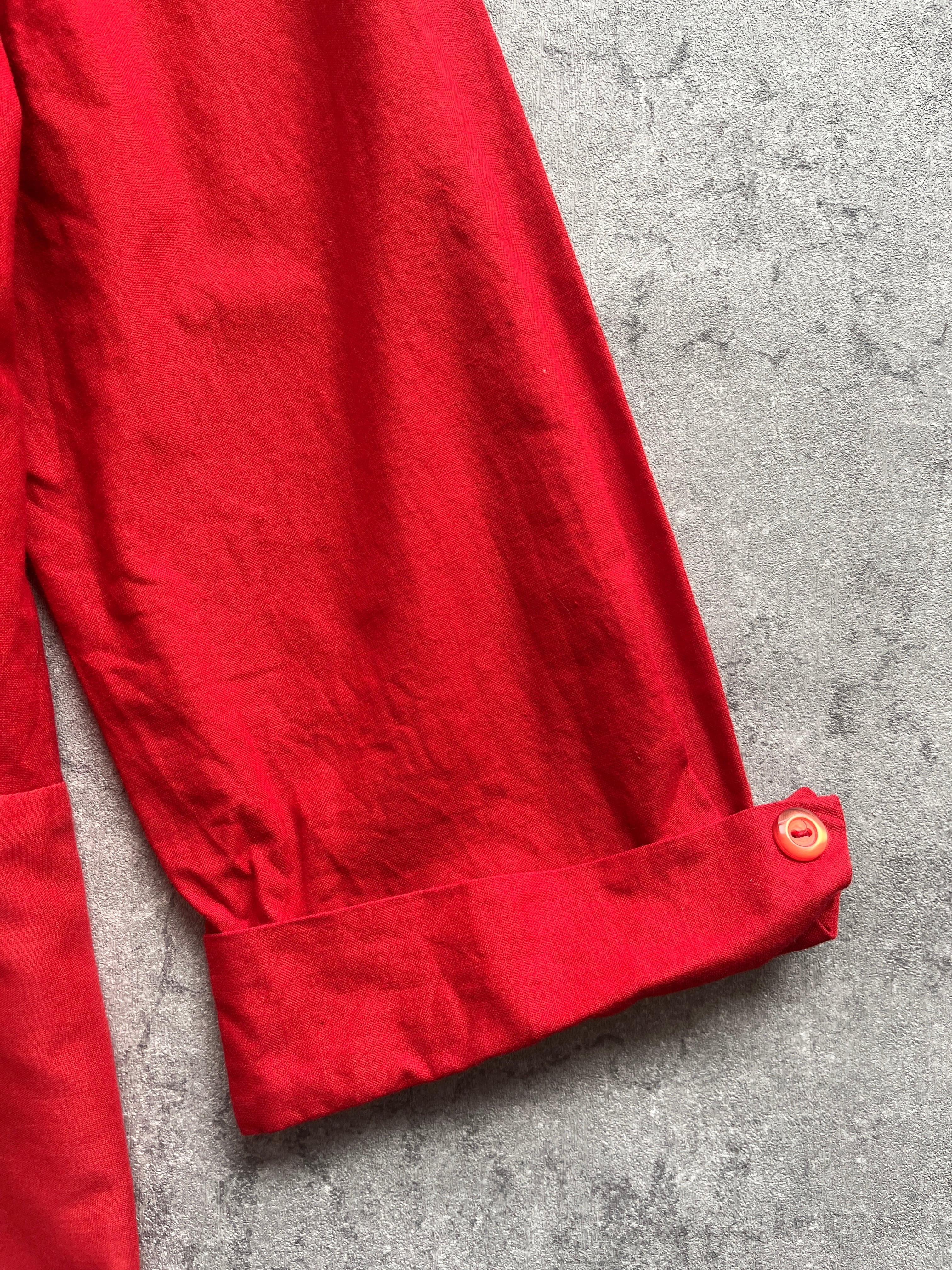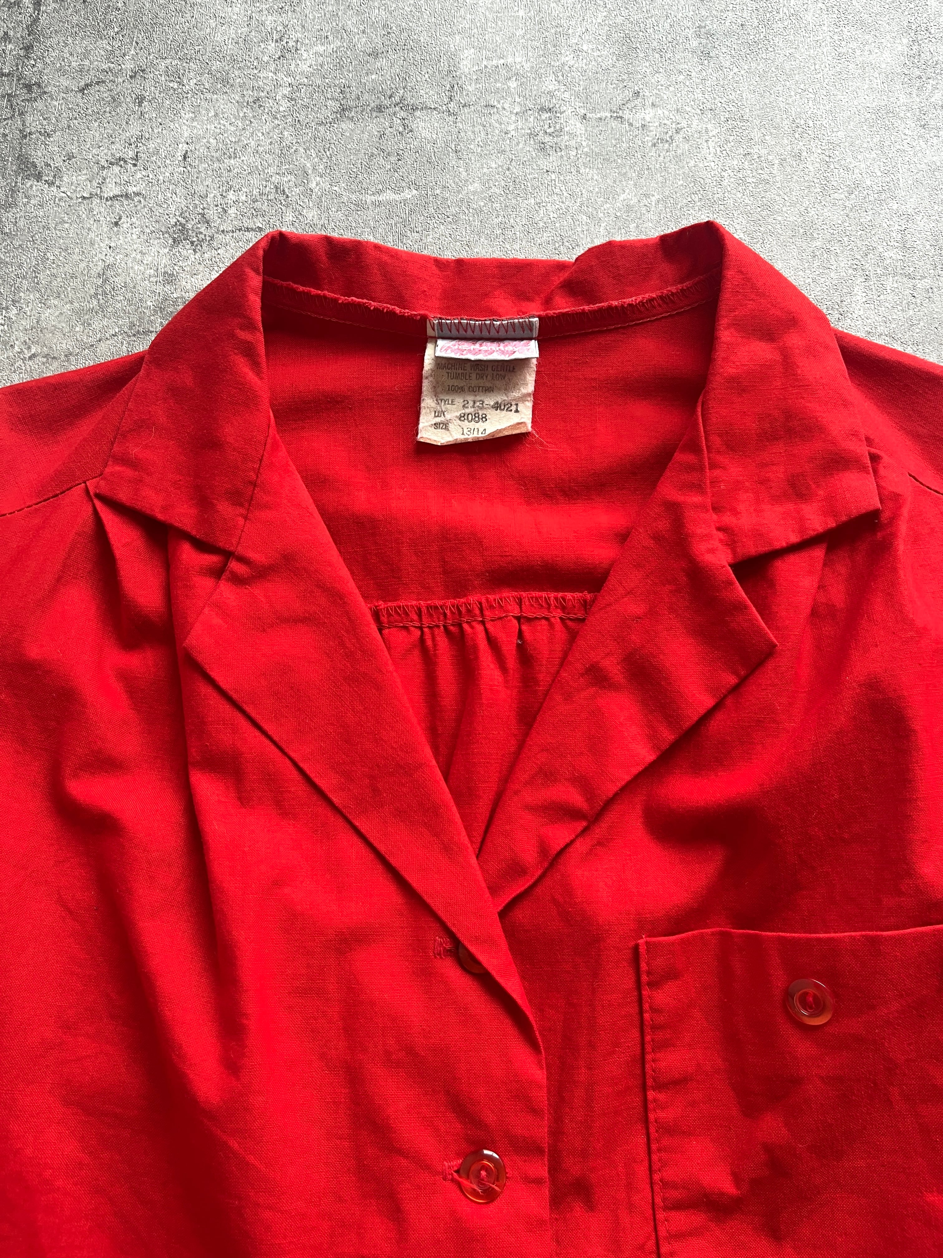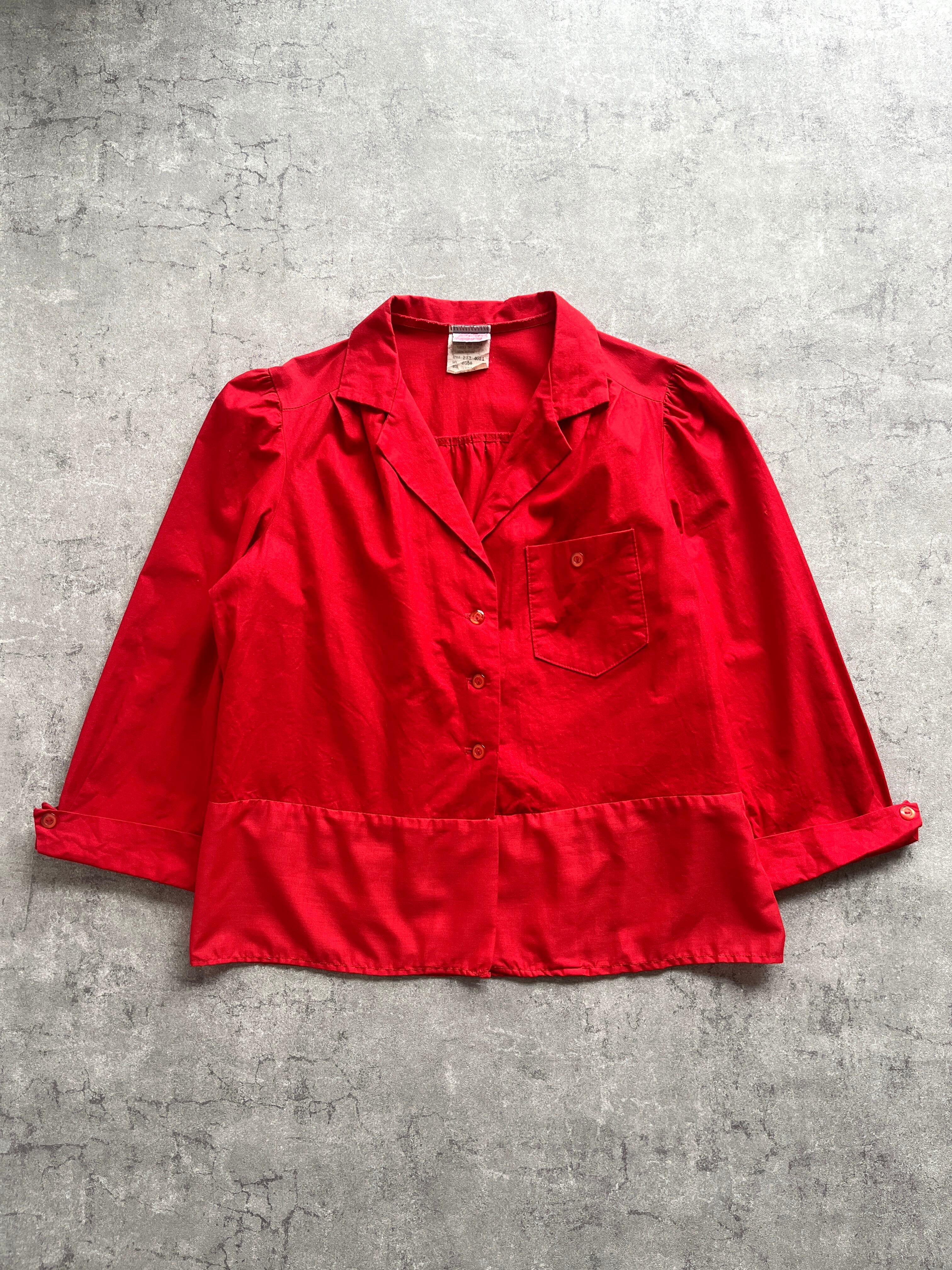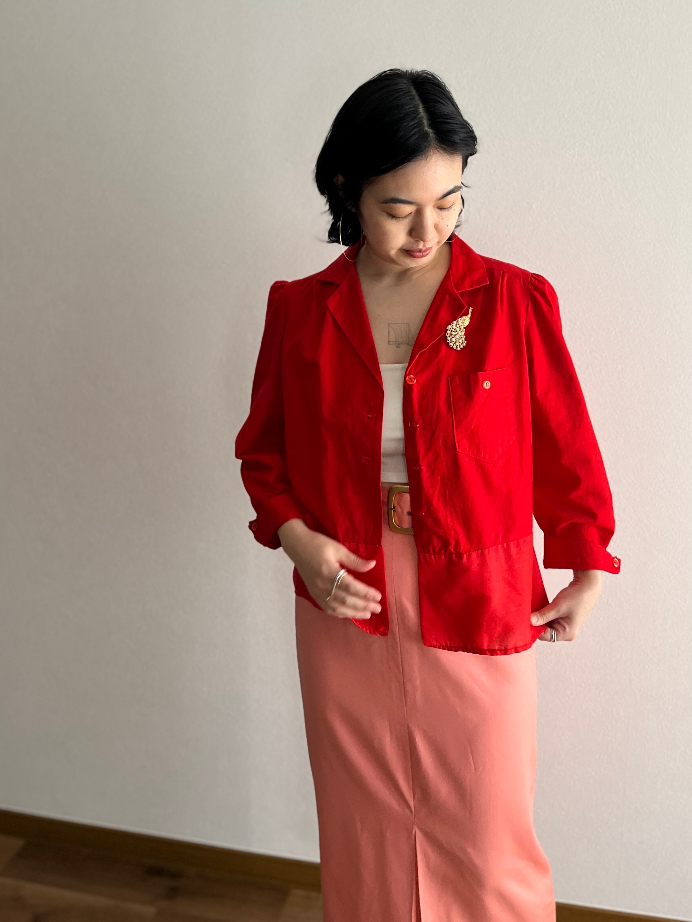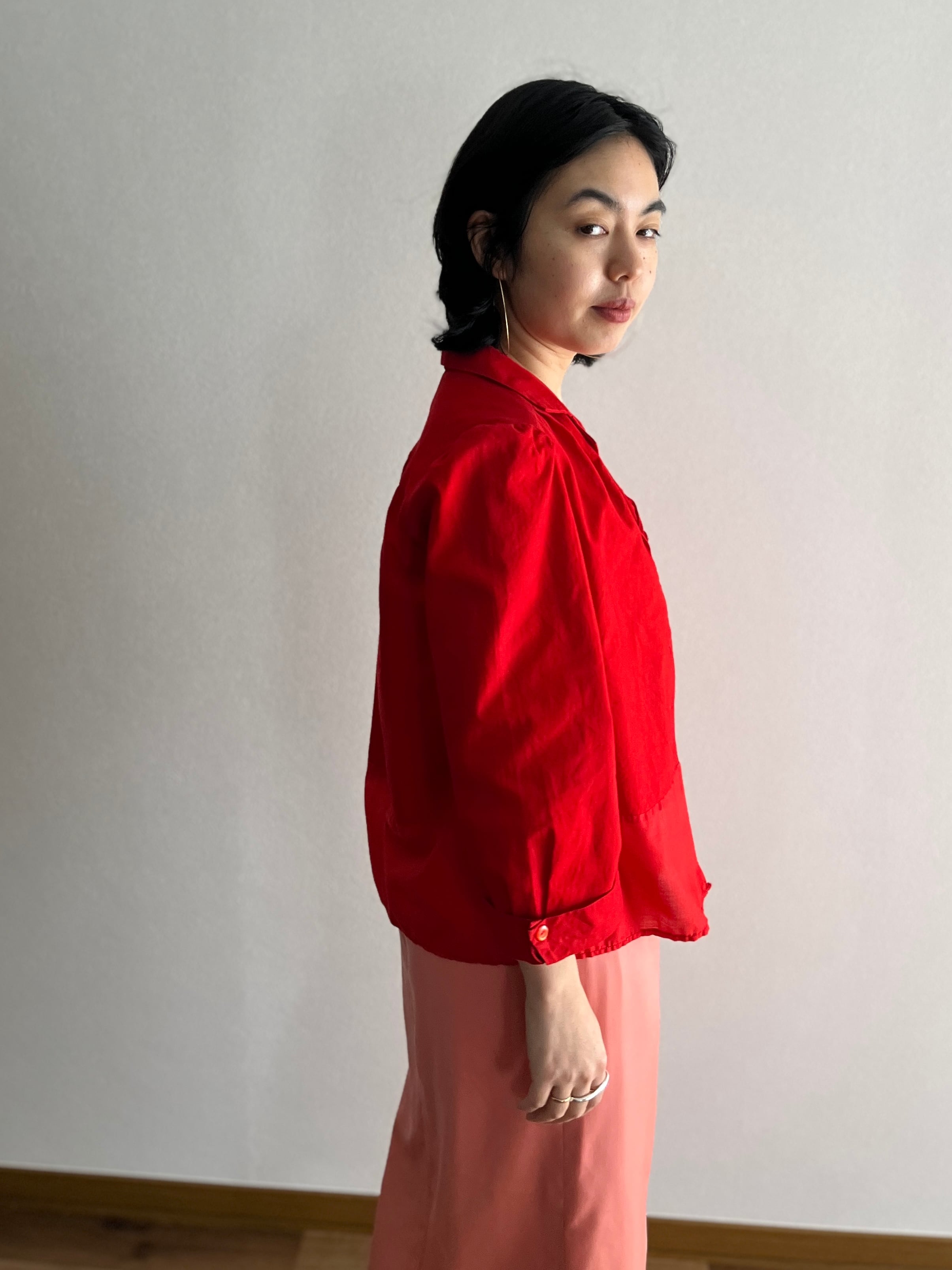 オープンカラー×肩のギャザー×袖の折り返しは、古き良きアメリカのダイナーを思わせます。