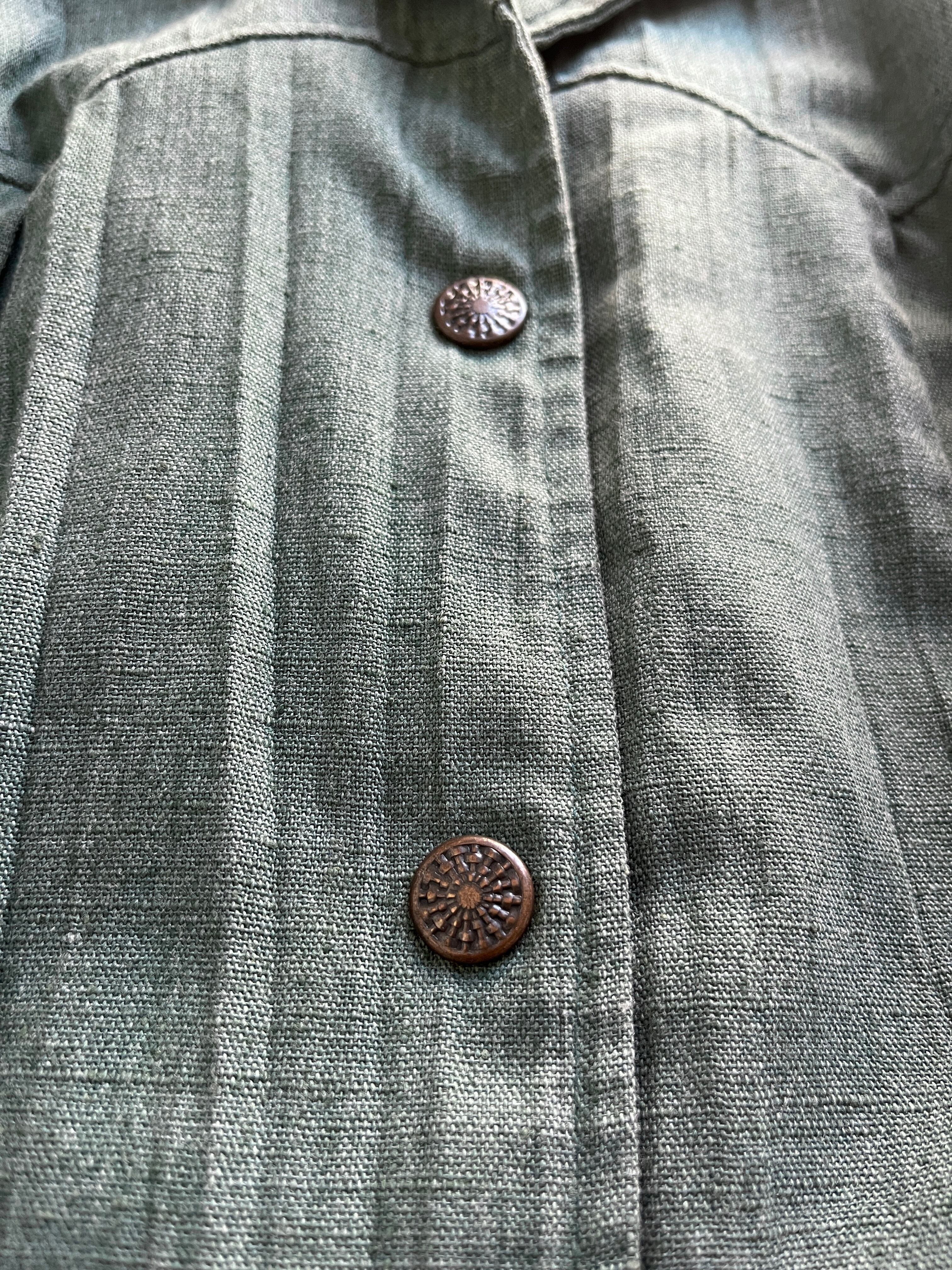 ウエスタンヨークやウエストベルトのデザイン、特にこの時代特有のスナップボタンの彫りといった細かいディテールが、70's好きには堪らない一点!