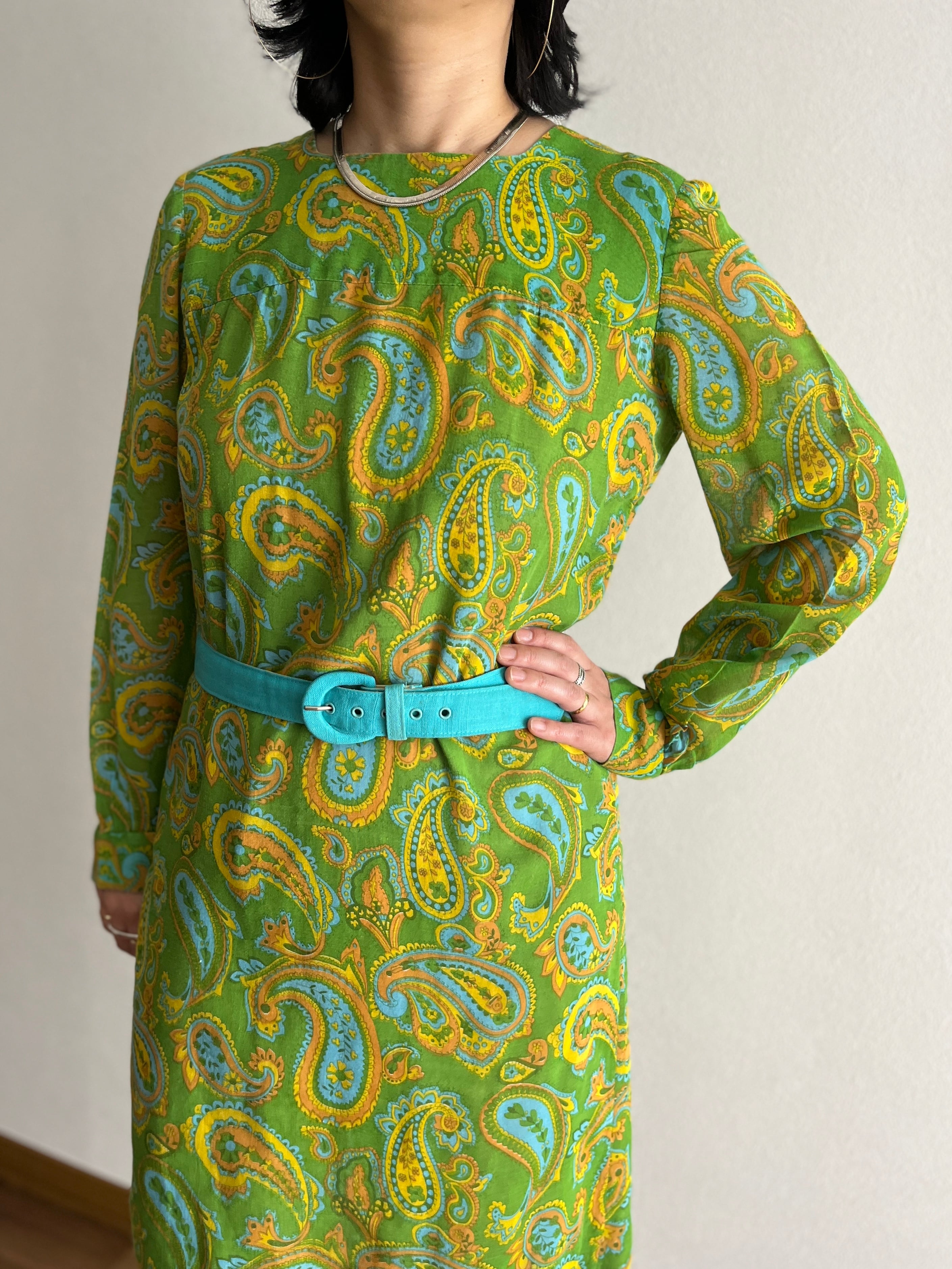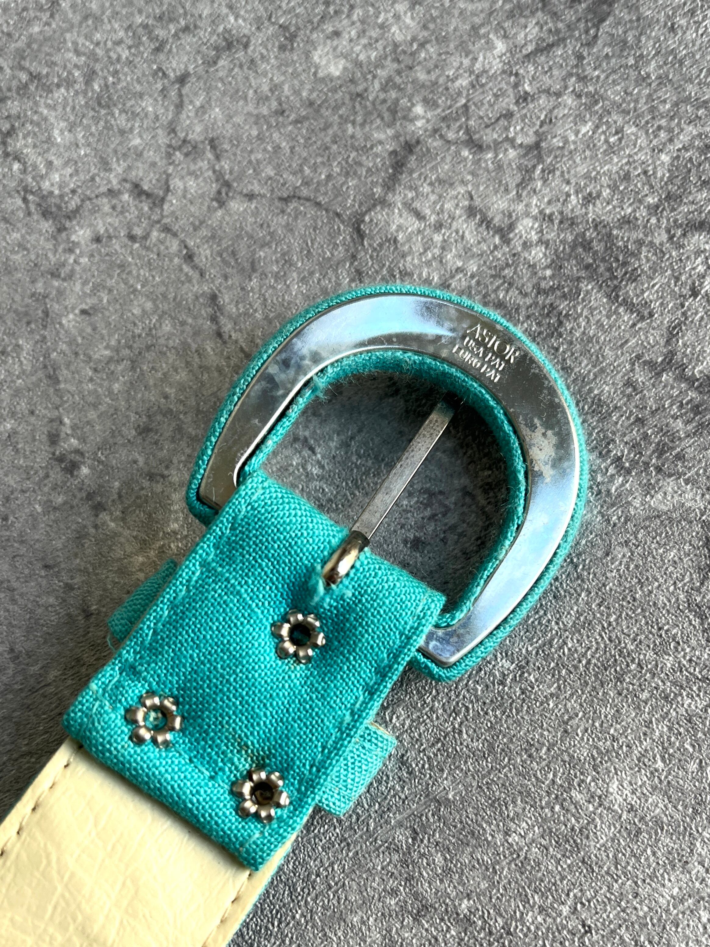 レザーの上に鮮やかなシアンブルーのコットン地が張られた、ユーズドベルトならではのこちら。太さの変わるカーブが入ったバックルまで、丁寧な仕上がりです。