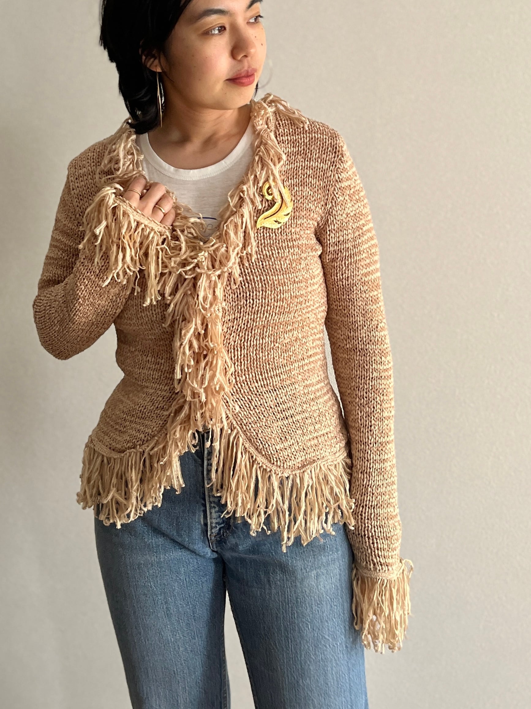 コード編み×フリンジが春らしいニットジャケット!ベージュ×ピンクベージュの色合いも綺麗で、ほぼ新品のような状態の一着です。