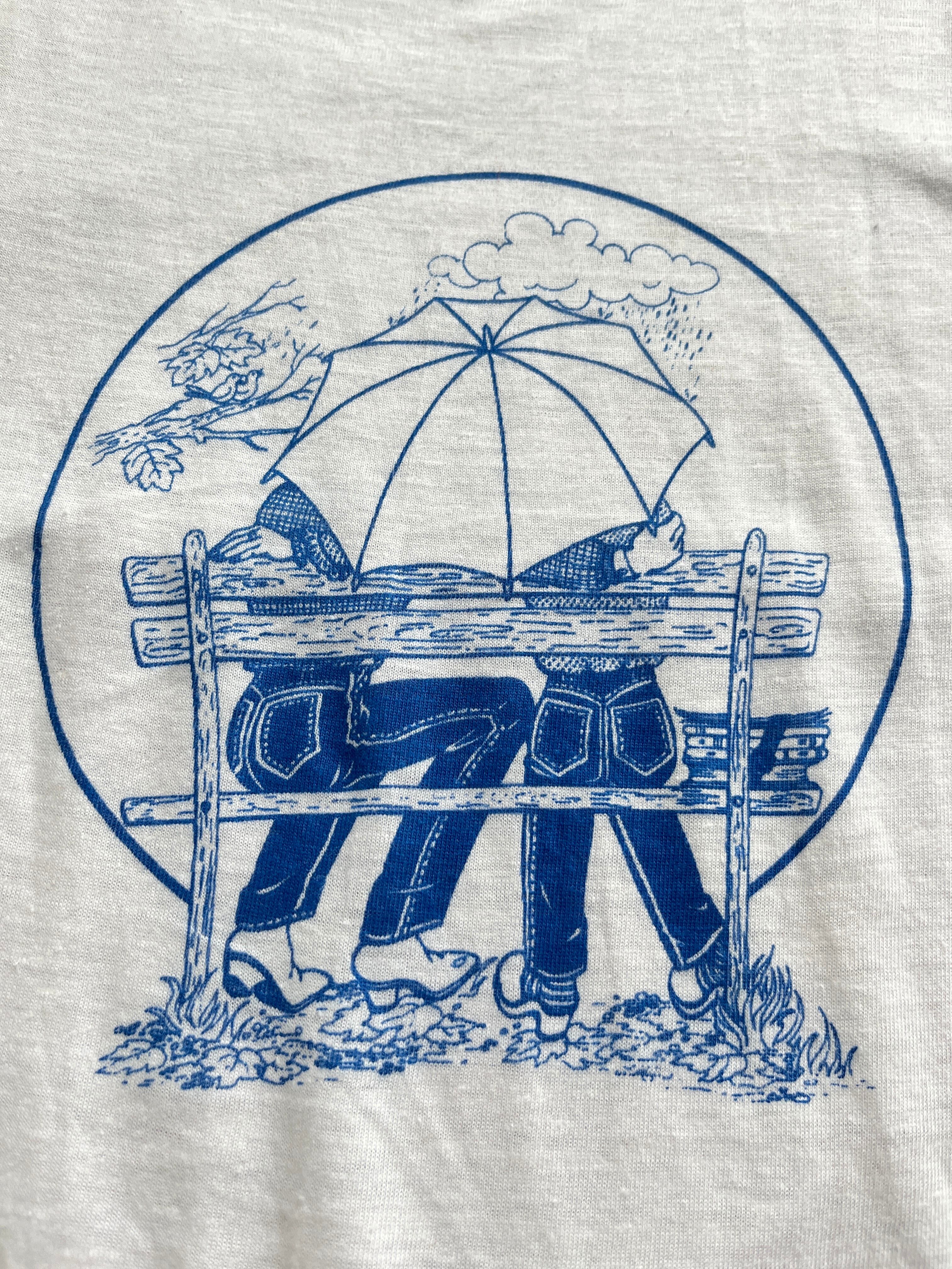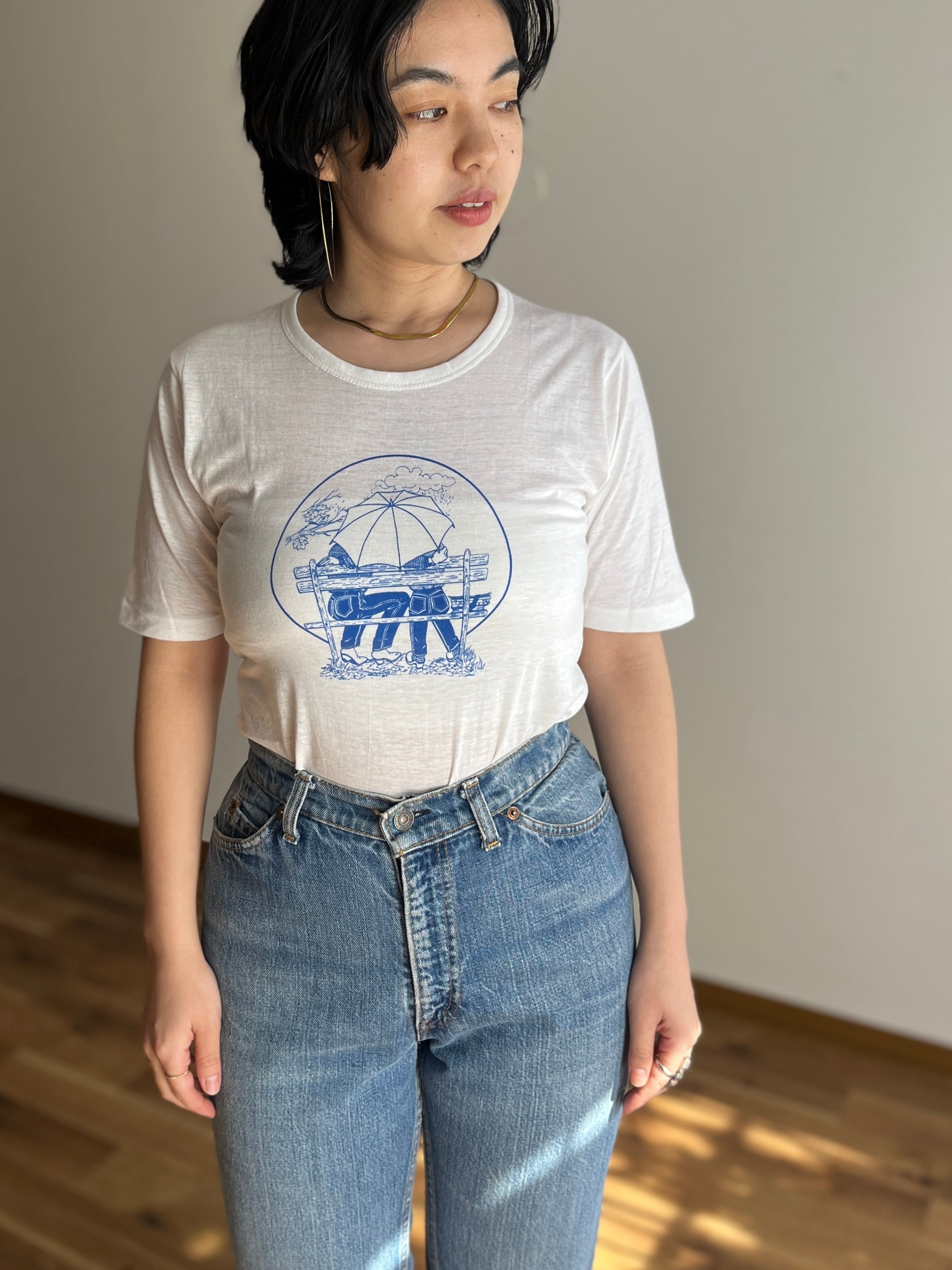 袖が長くタイトなシルエットのTシャツ中央に、ペアルックのカップルが。ベンチで雨が止むのを待っている、優しい光景を切り取った一枚。