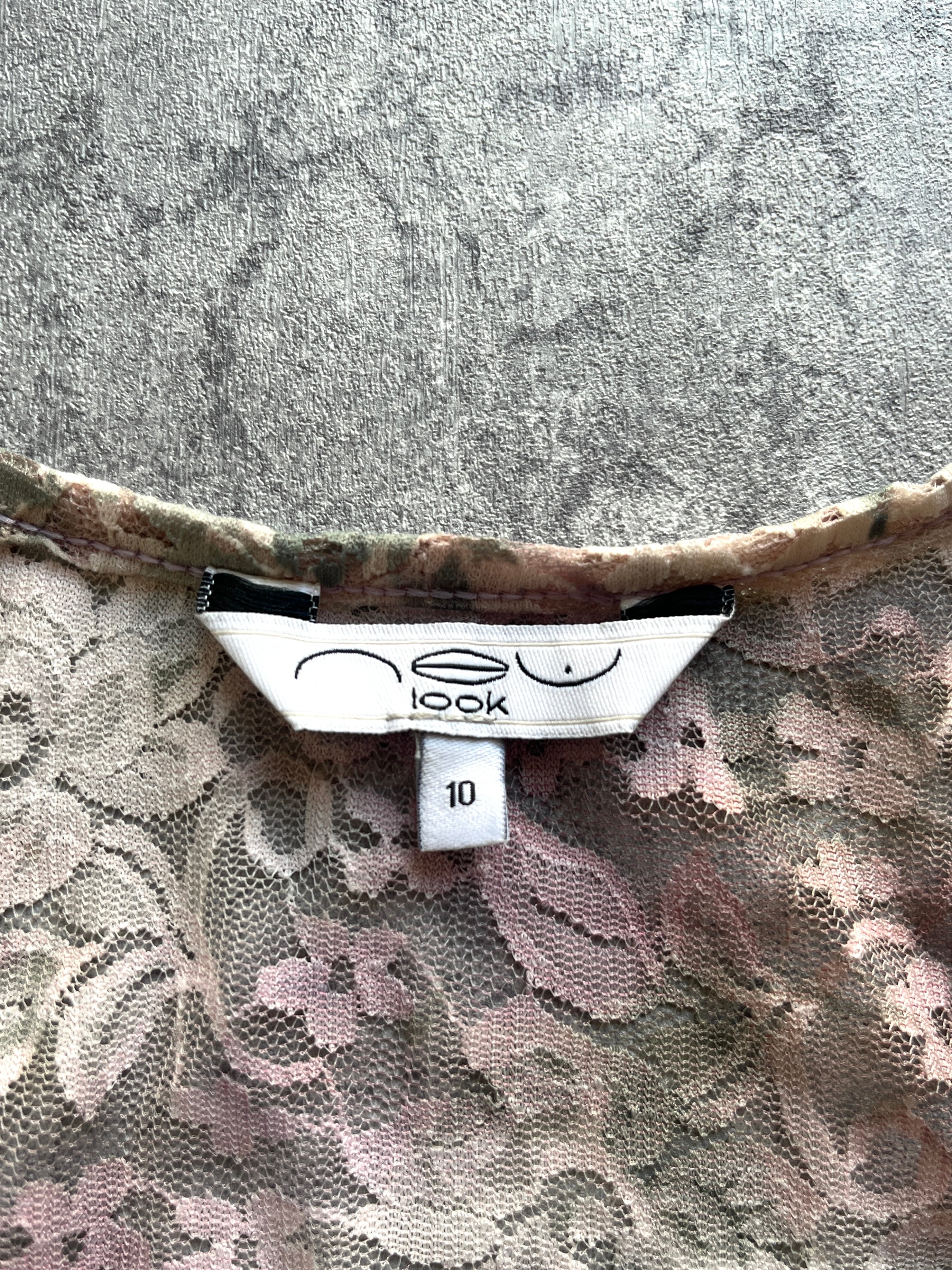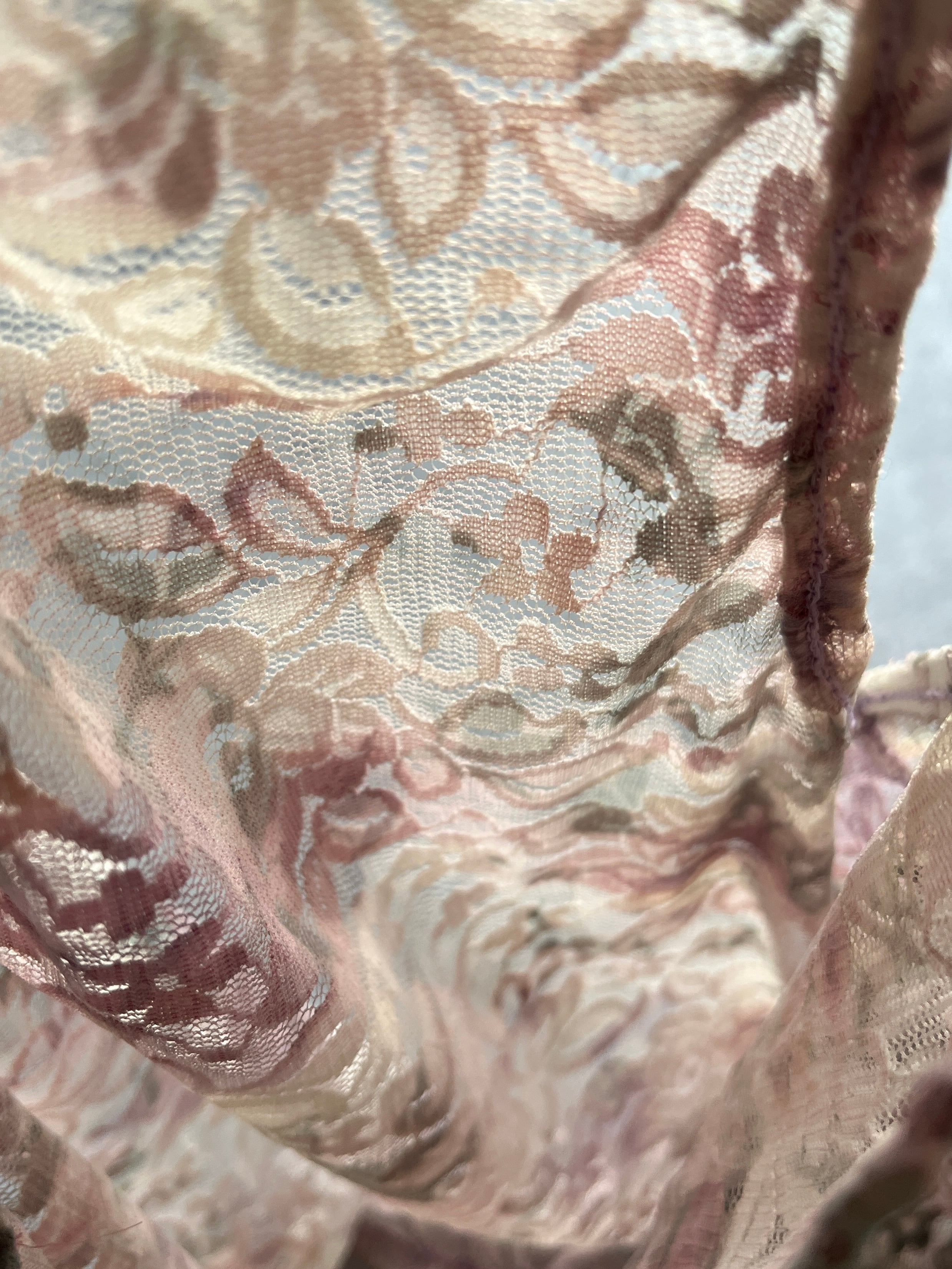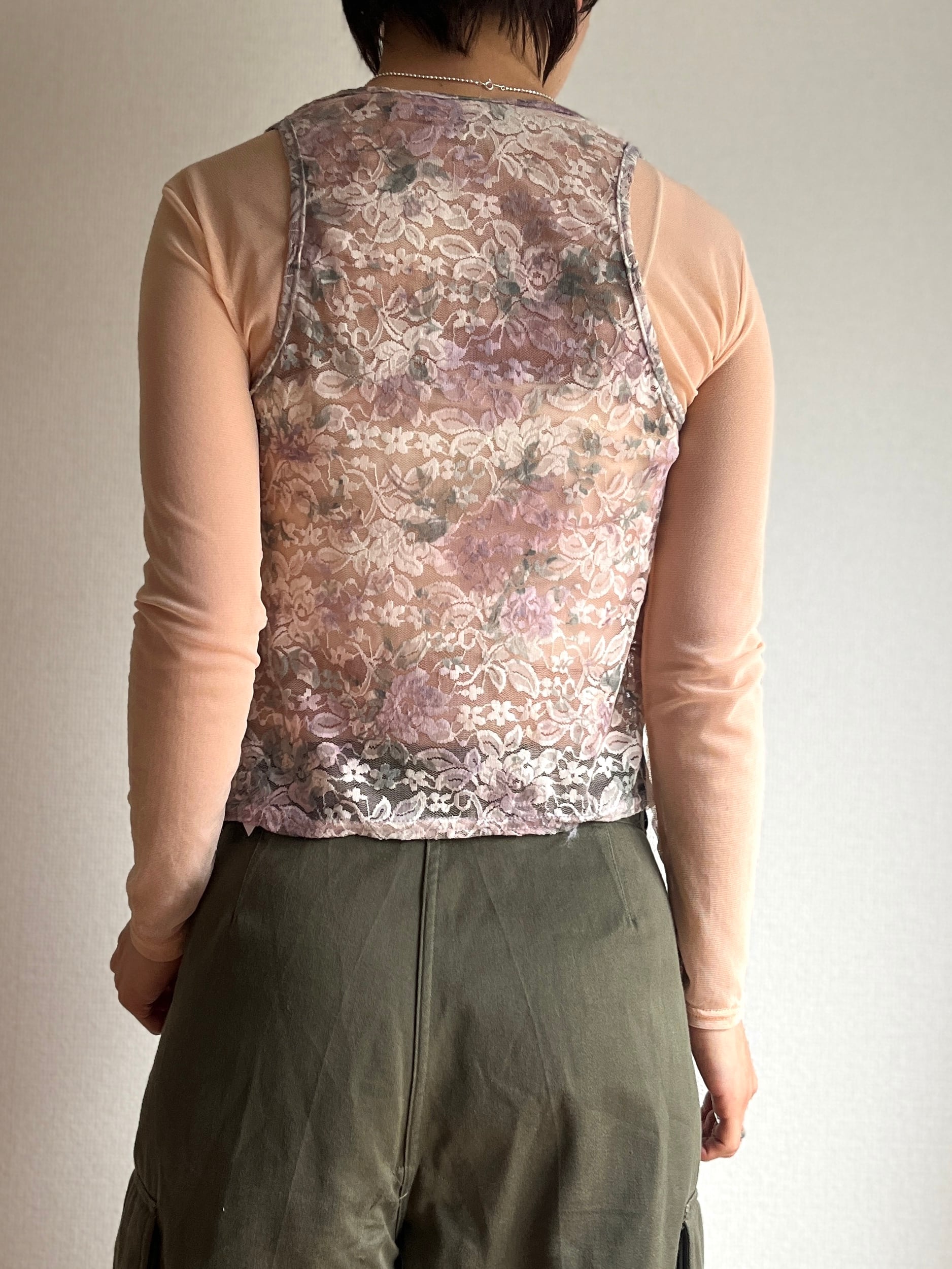 レースの上からパープル2色とグリーンの染み込むタイプのプリントを重ねた、ガータードロップタンク。