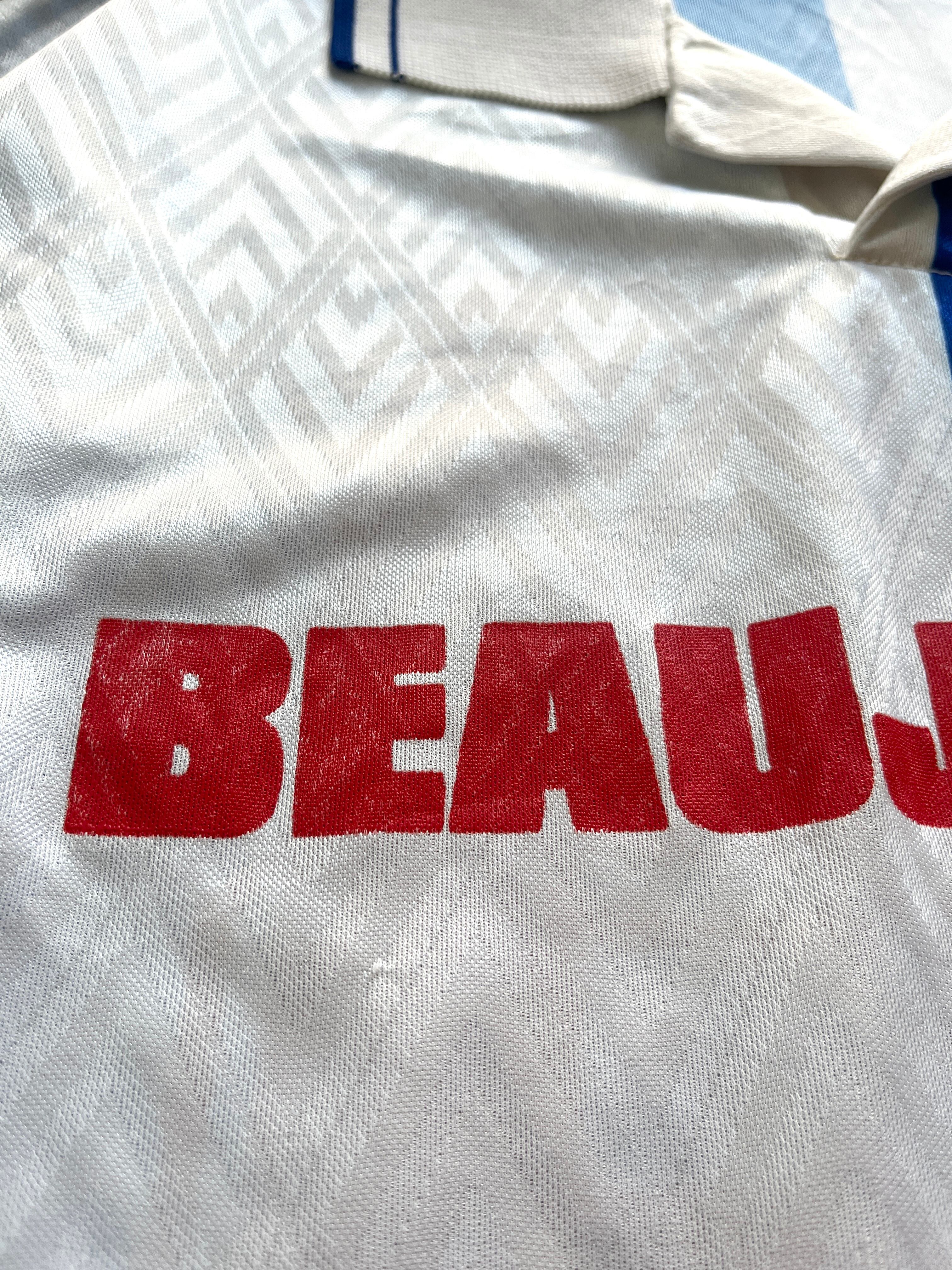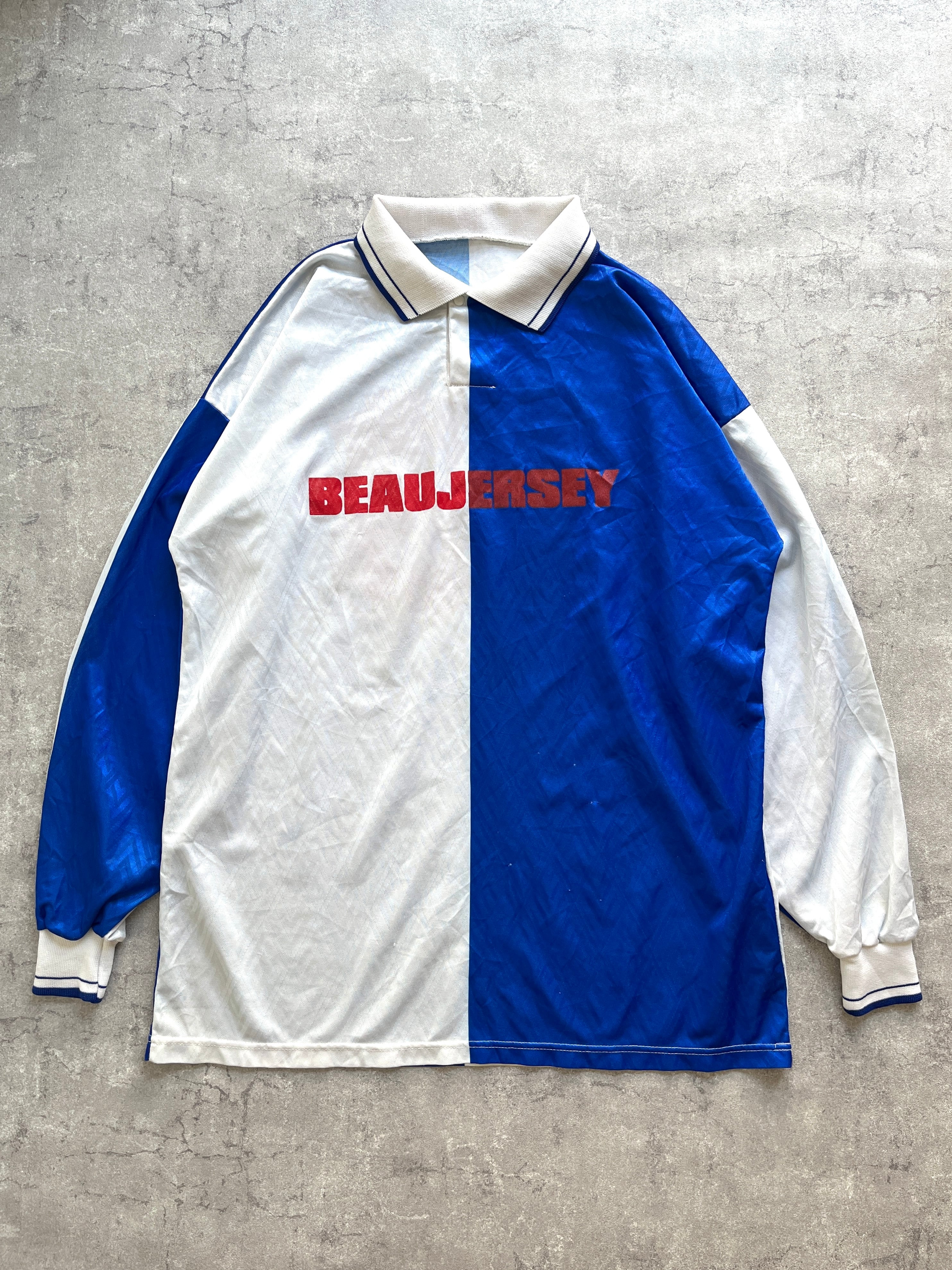 リーグ優勝を果たした1994-1995年にasicsが手がけた、イングランドのサッカークラブ、”ブラックバーン・ローヴァーズFC”のユニフォームをベースに作られたであろう、企業のサッカーチームのユニフォーム。