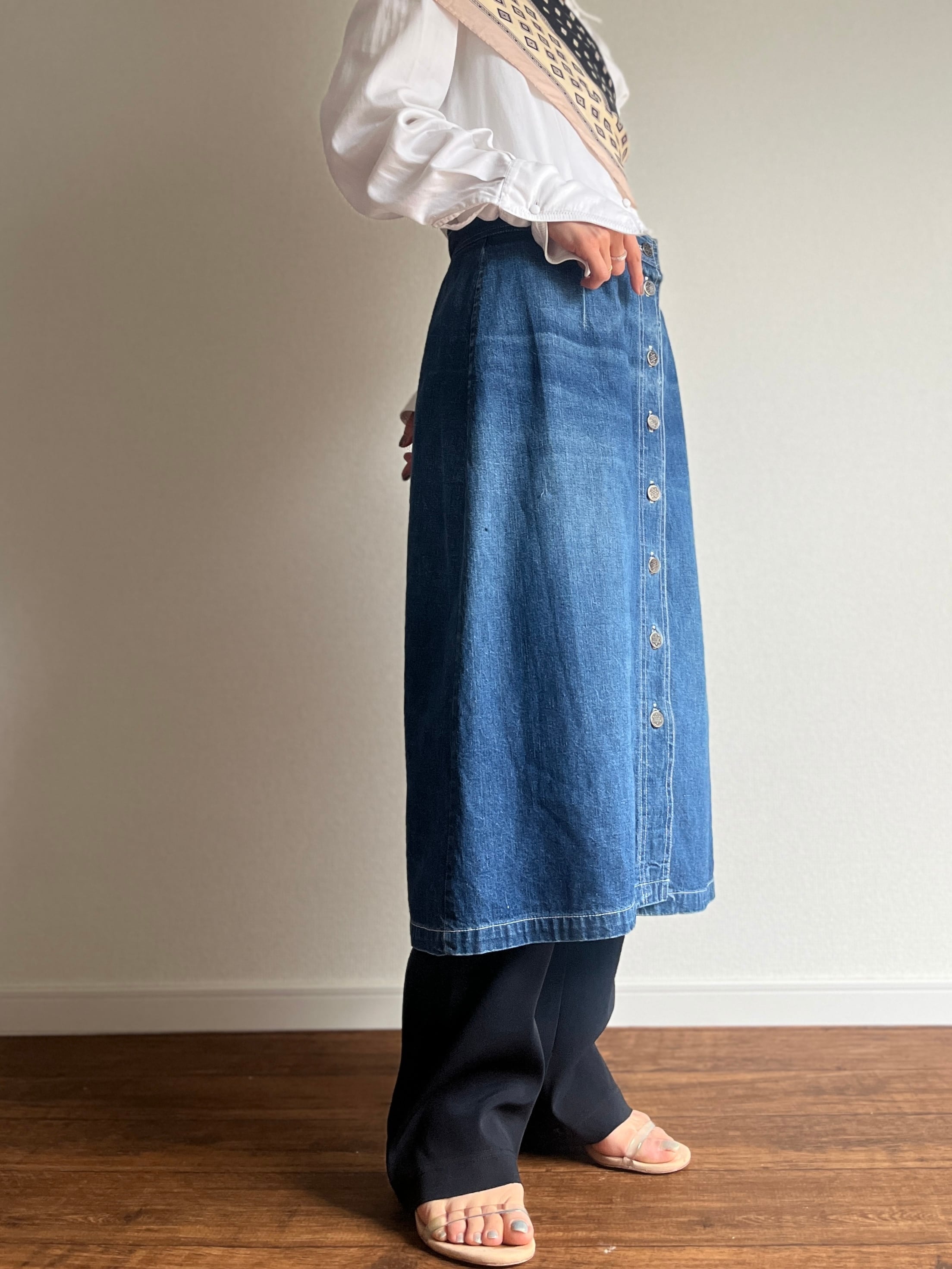 程よい色落ちで、巻きスカートのように使ったりアレンジもしやすい、軽い春夏向きのデニムスカートです。