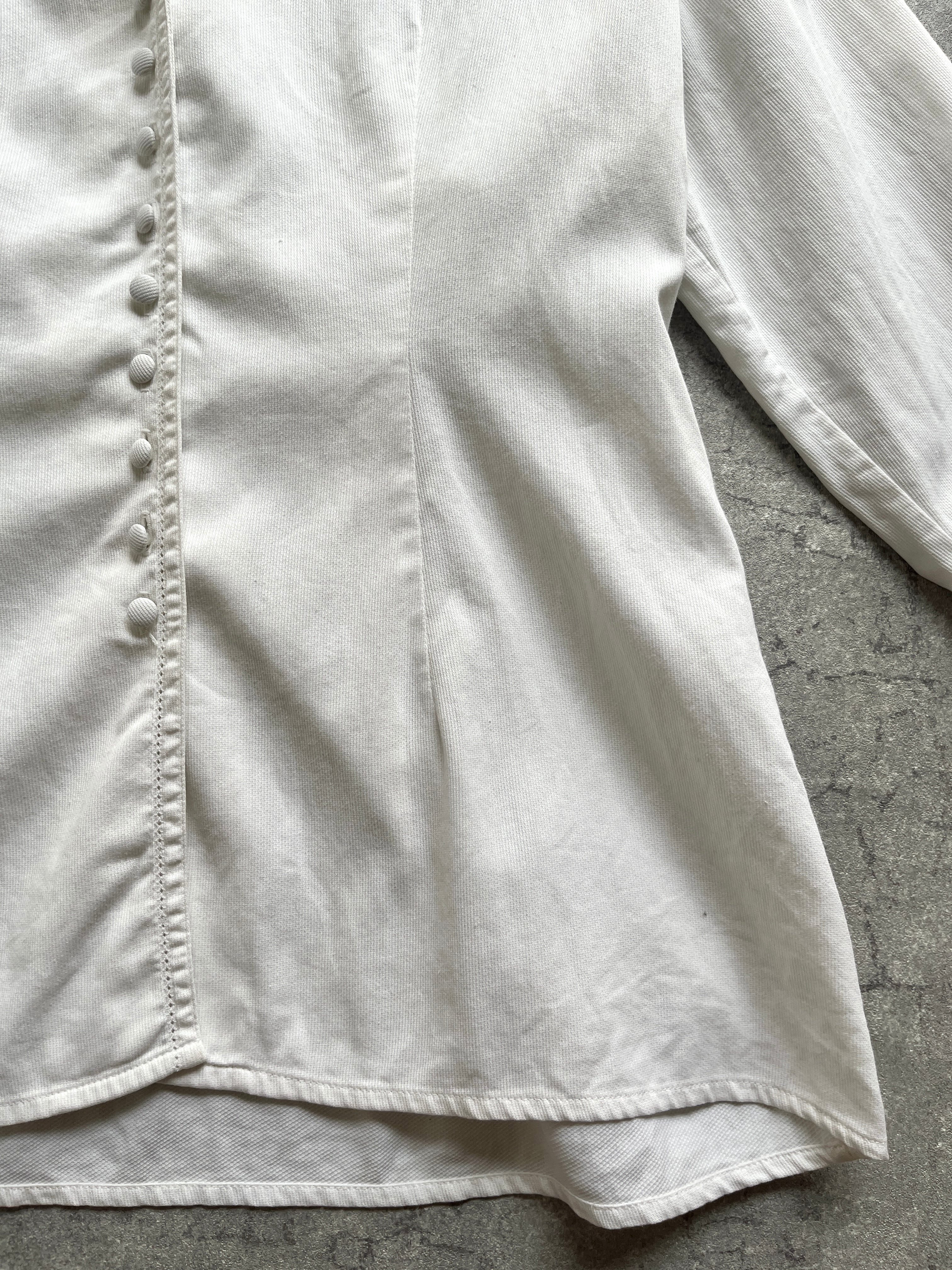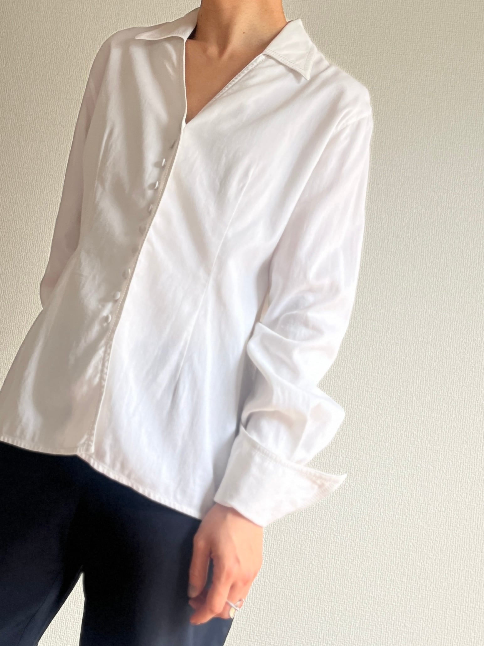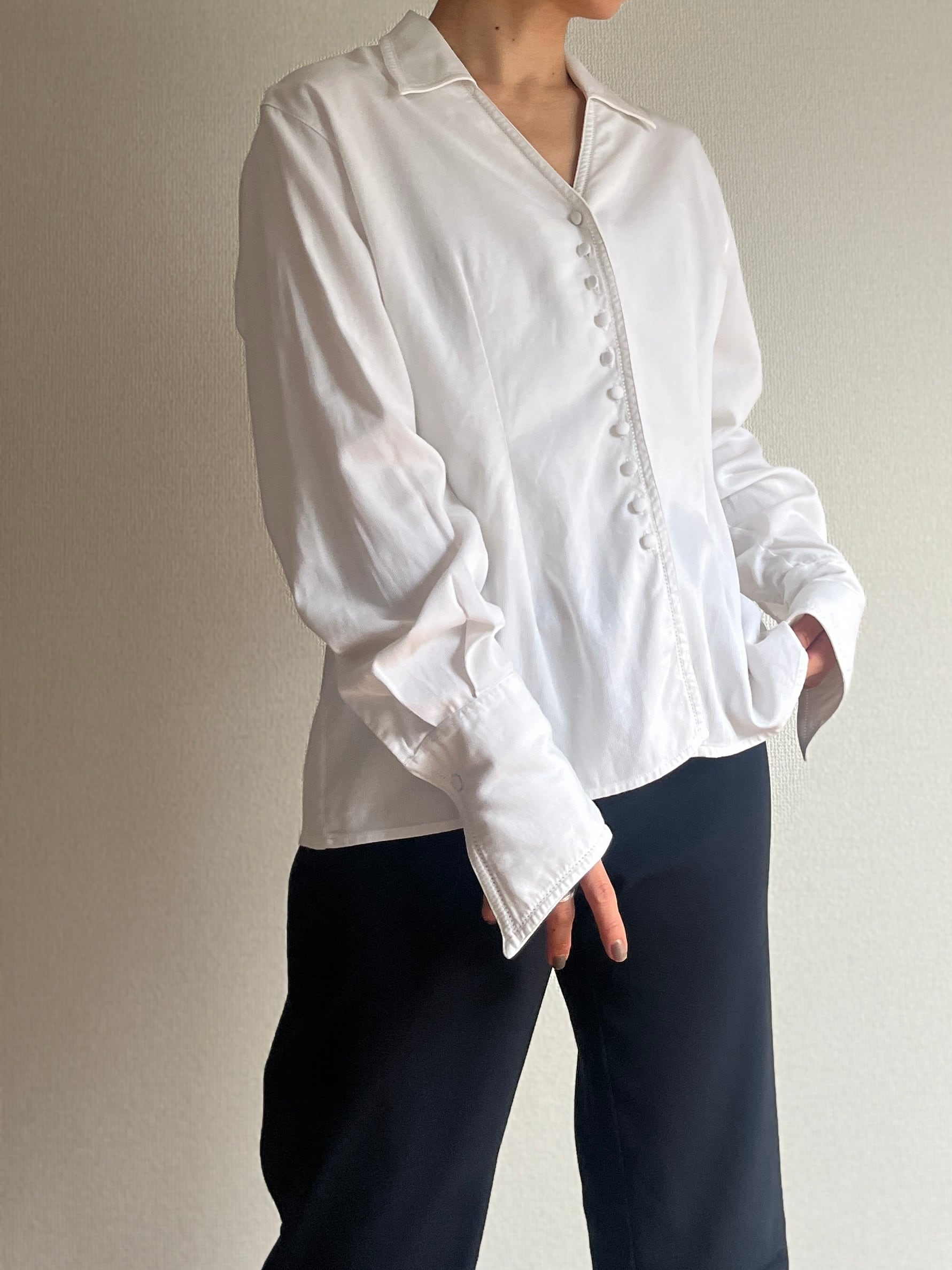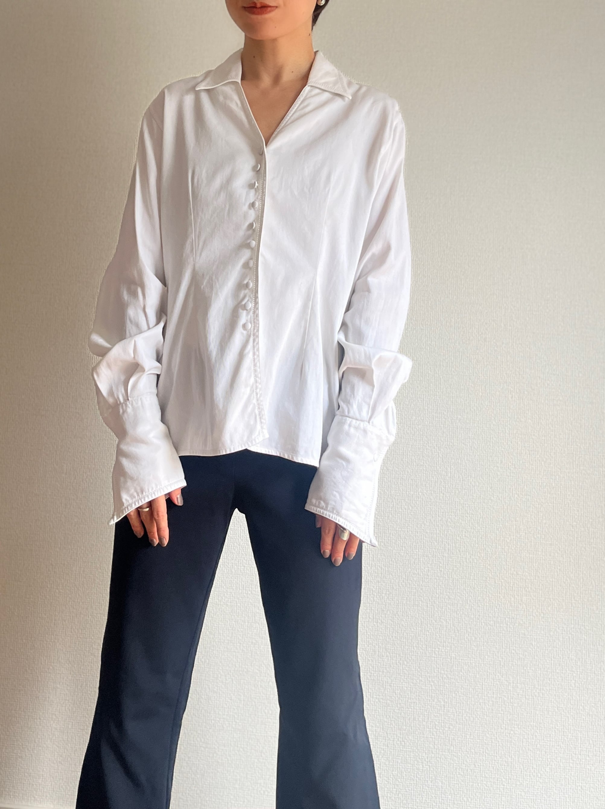 ウエストを綺麗に見せるシルエットや、感覚の狭いくるみボタンがいかにもフランスらしいデザインの、オープンカラーシャツです。