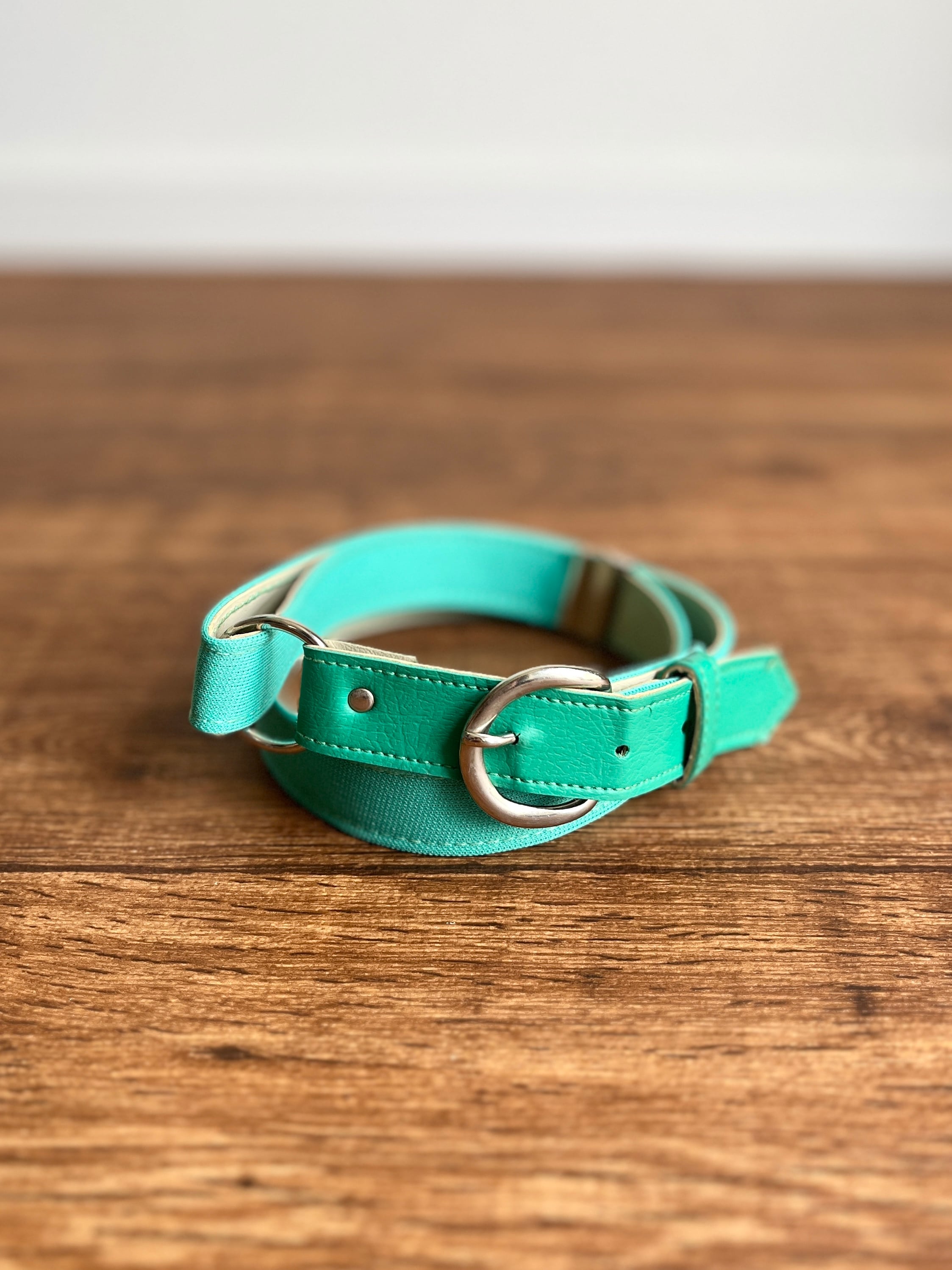 ベルト自体もリングで繋がれた、フェイクレザー×共布の凝ったデザインです。