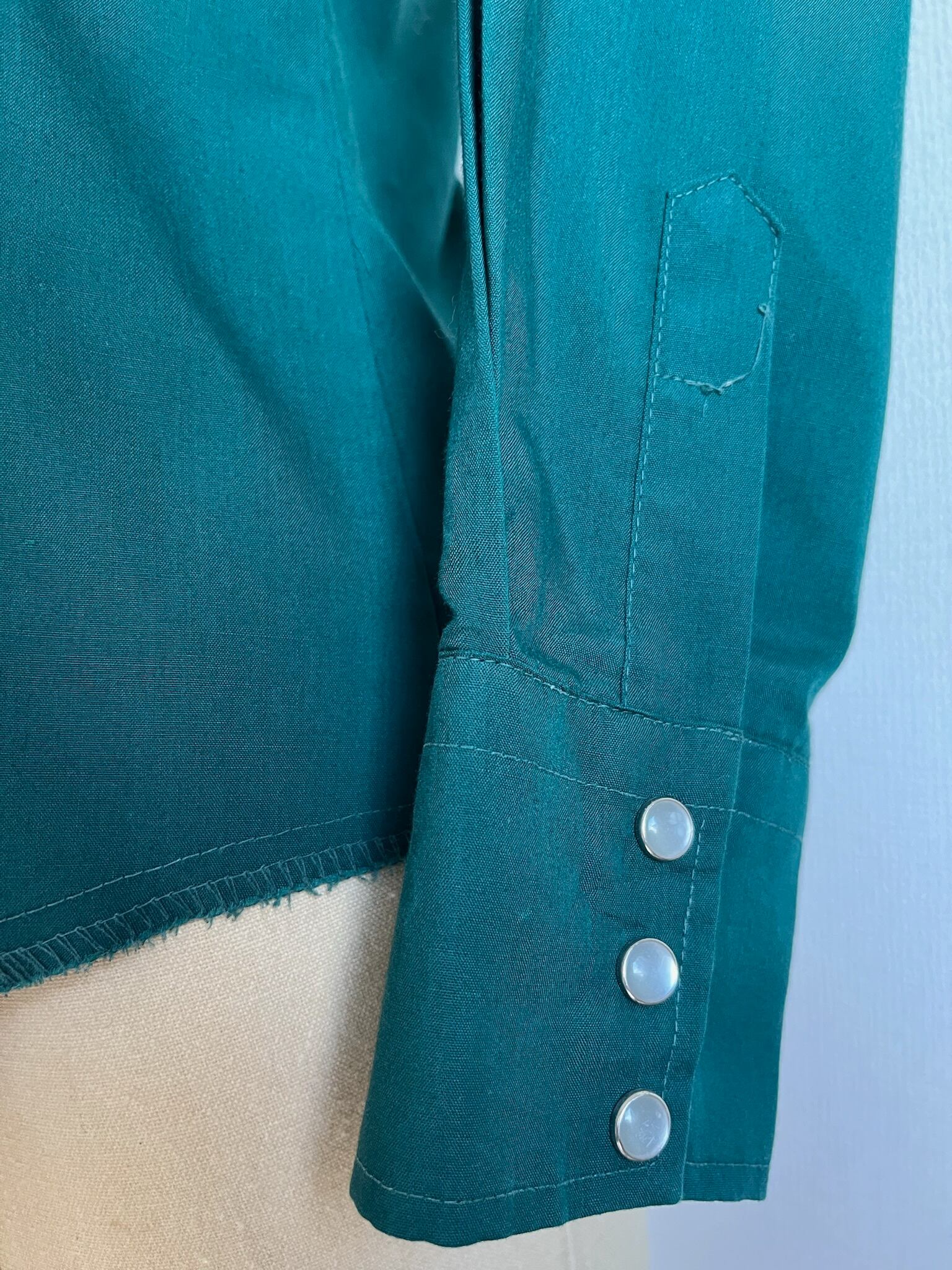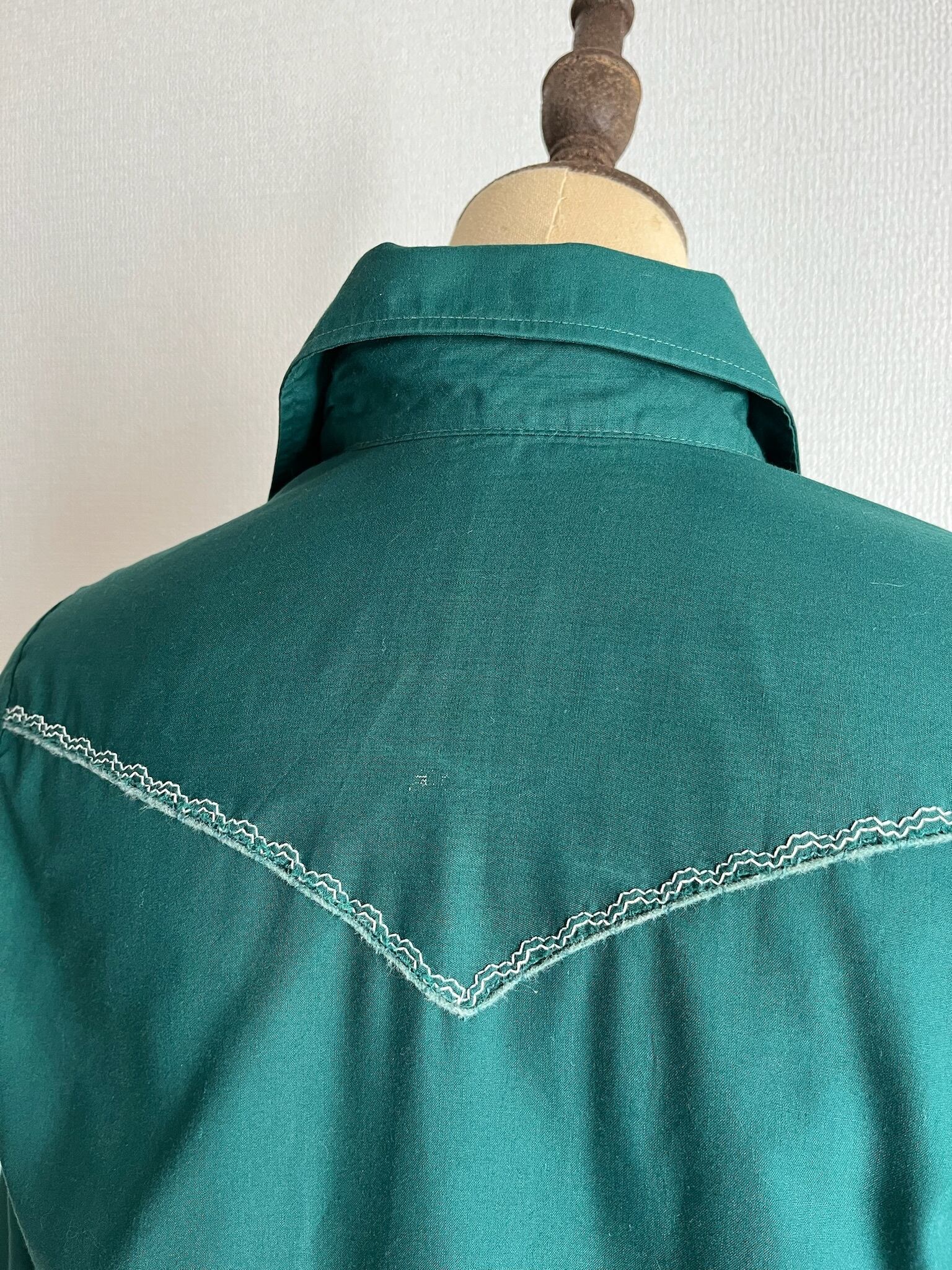 深みのあるグリーンカラーはウェスタンシャツでは珍しく、インディゴ、キャメル、ブラック等ボトムスの定番カラーとの合わせがしやすいお品です。