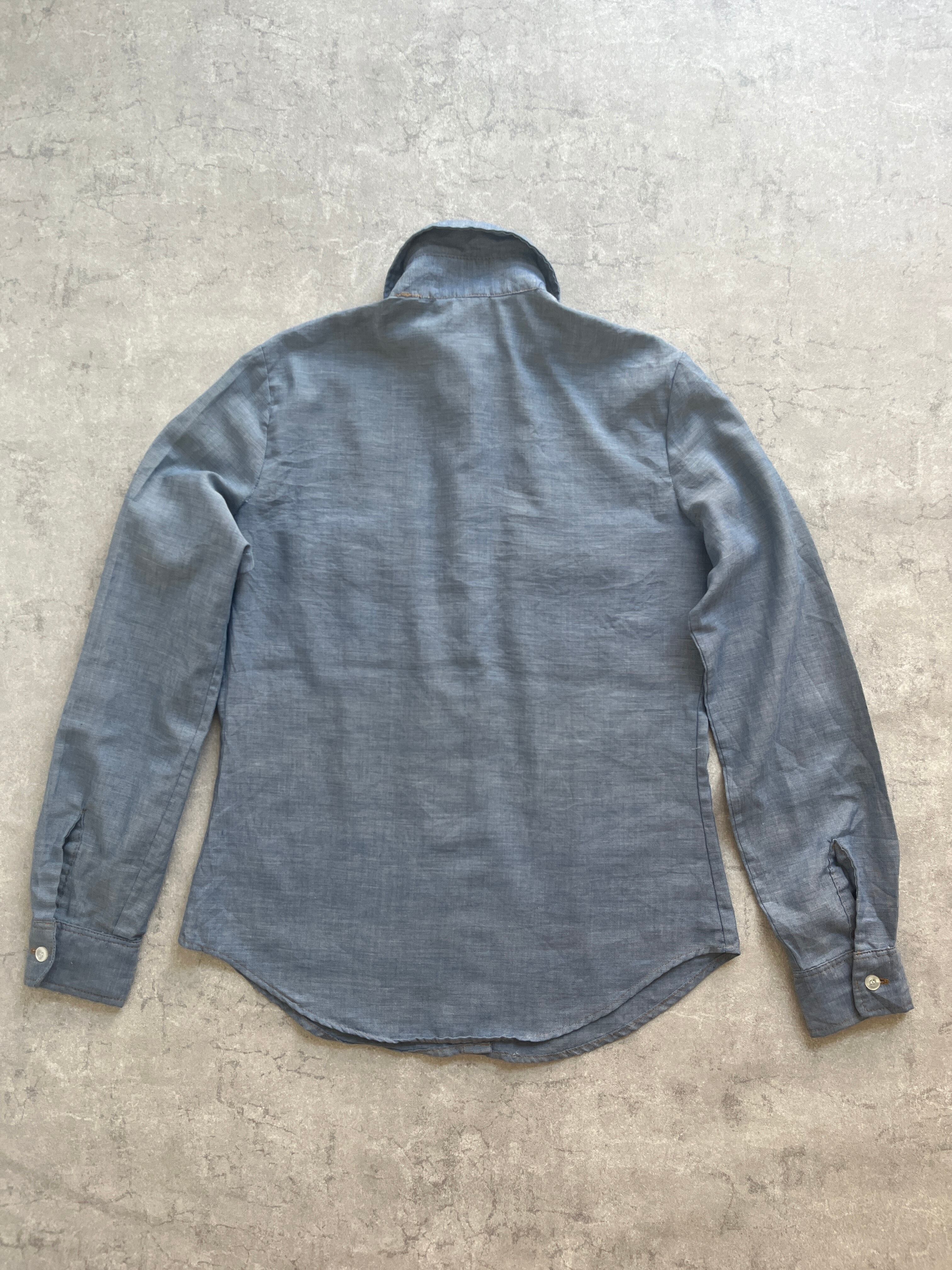 ウエスタンシャツを思わせる胸ポケットのディテールが効いており、シャツ好きの心をくすぐる一着。