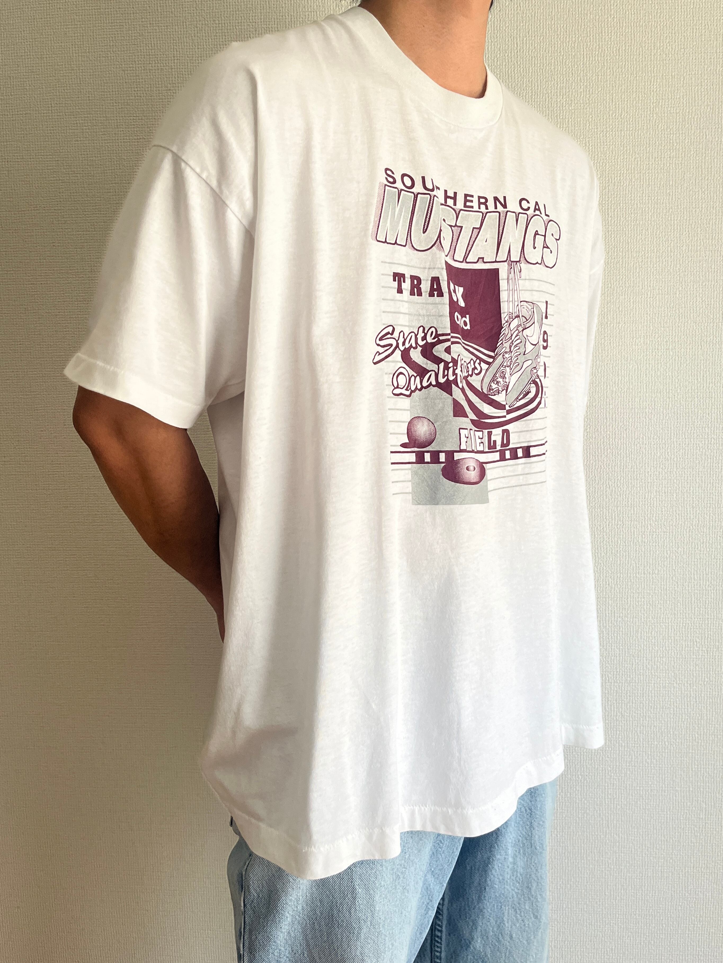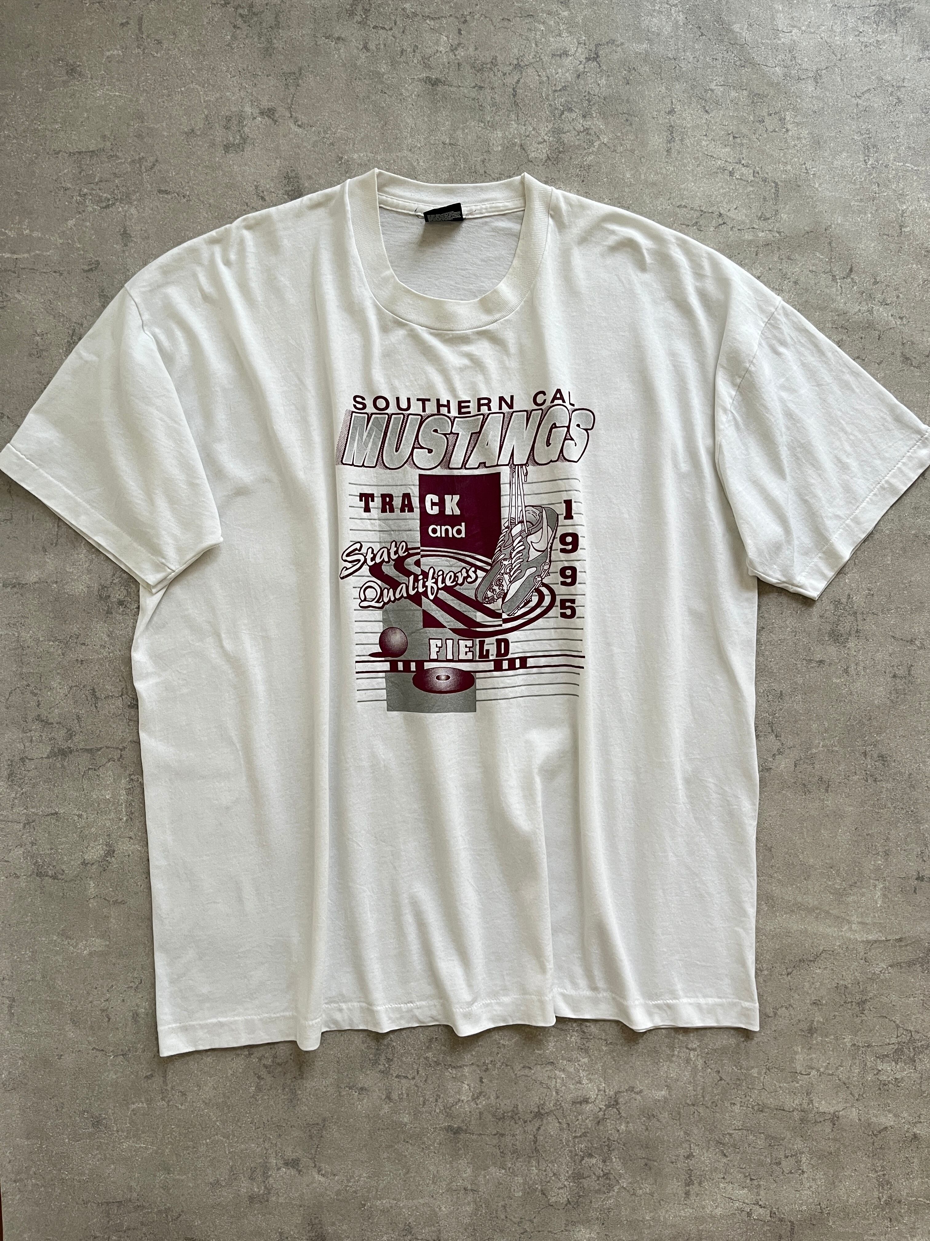 南カリフォルニアの陸上チームのTシャツのようですが、砲丸や高跳びのバー、トラックやNIKEのトラックシューズなど粉団に陸上競技にまつわるアイテムが盛り込まれたデザイン。1995年のもの。